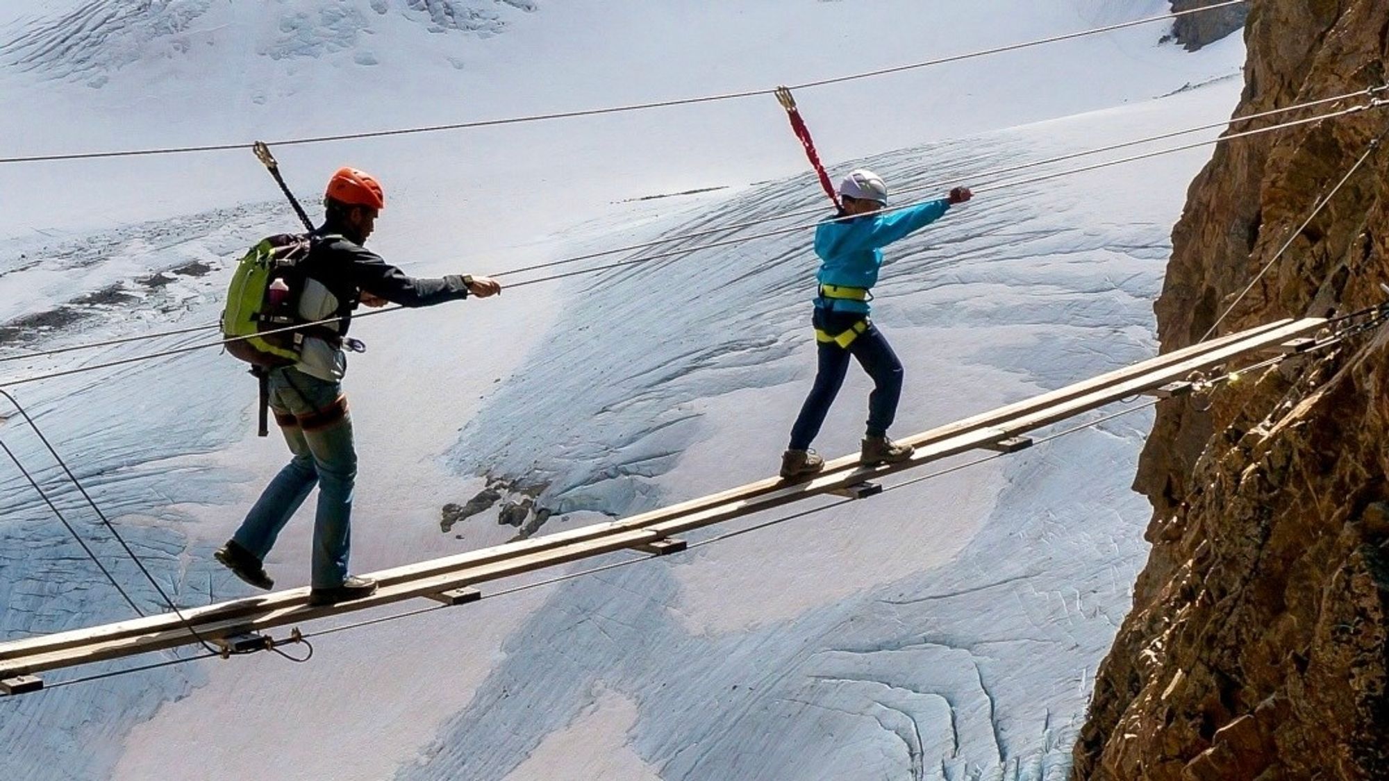 Een perfect uitgeruste via ferrata, net over de grens in het Zwitserse Pontresina. Je klimt tegen een wand van bijna 500 meter hoog en onderweg kom je uitdagingen tegen als trappen, traverses, een touwbrug en een spinnenweb. De moeilijkheidsgraad is K4+ en je bent ongeveer anderhalf uur bezig.