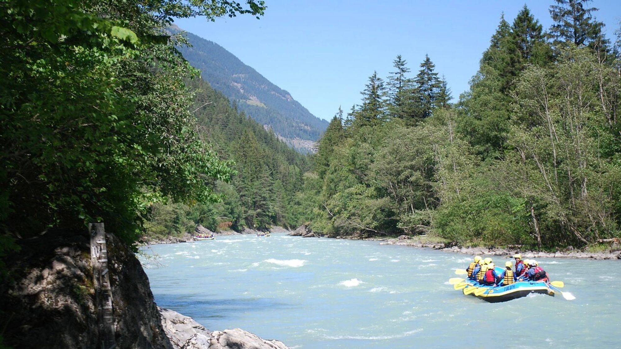 Voor gezinnen met jongere kinderen is er een aparte gezinstocht op de Inn, geschikt vanaf 5 jaar. Deze tocht heeft moeilijkheidsgraad II en is ontworpen voor een veilige en ontspannen eerste raftingervaring. Op het kalmere deel van de rivier geniet je samen van kleine golven, lichte versnellingen en het frisse, heldere water. Onderweg is er volop gelegenheid om te zwemmen en het landschap van het Inntal in je op te nemen. Iedereen in de boot helpt mee met peddelen, waardoor het een gezamenlijke ervaring wordt die je als gezin niet snel vergeet. De route is 10 kilometer lang en ook hier ben je ongeveer anderhalf uur op het water.