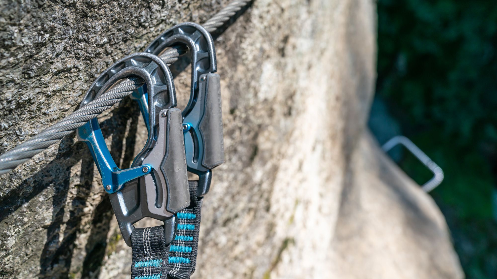 Laten we beginnen met het veiligheidsaspoect: Het gebruik van een klettersteigset is in principe heel eenvoudig. Je klimt altijd met beide karabiners op de staalkabel. De openingsrichting van de karabiner maakt niet uit. Als je op een punt aankomt waar de kabel aan de rotswand vast zit klik je de karabiners één voor één om. Dit is heel belangrijk dat je dit een voor een doet, zodat je altijd aan een kabel vast blijft zitten.