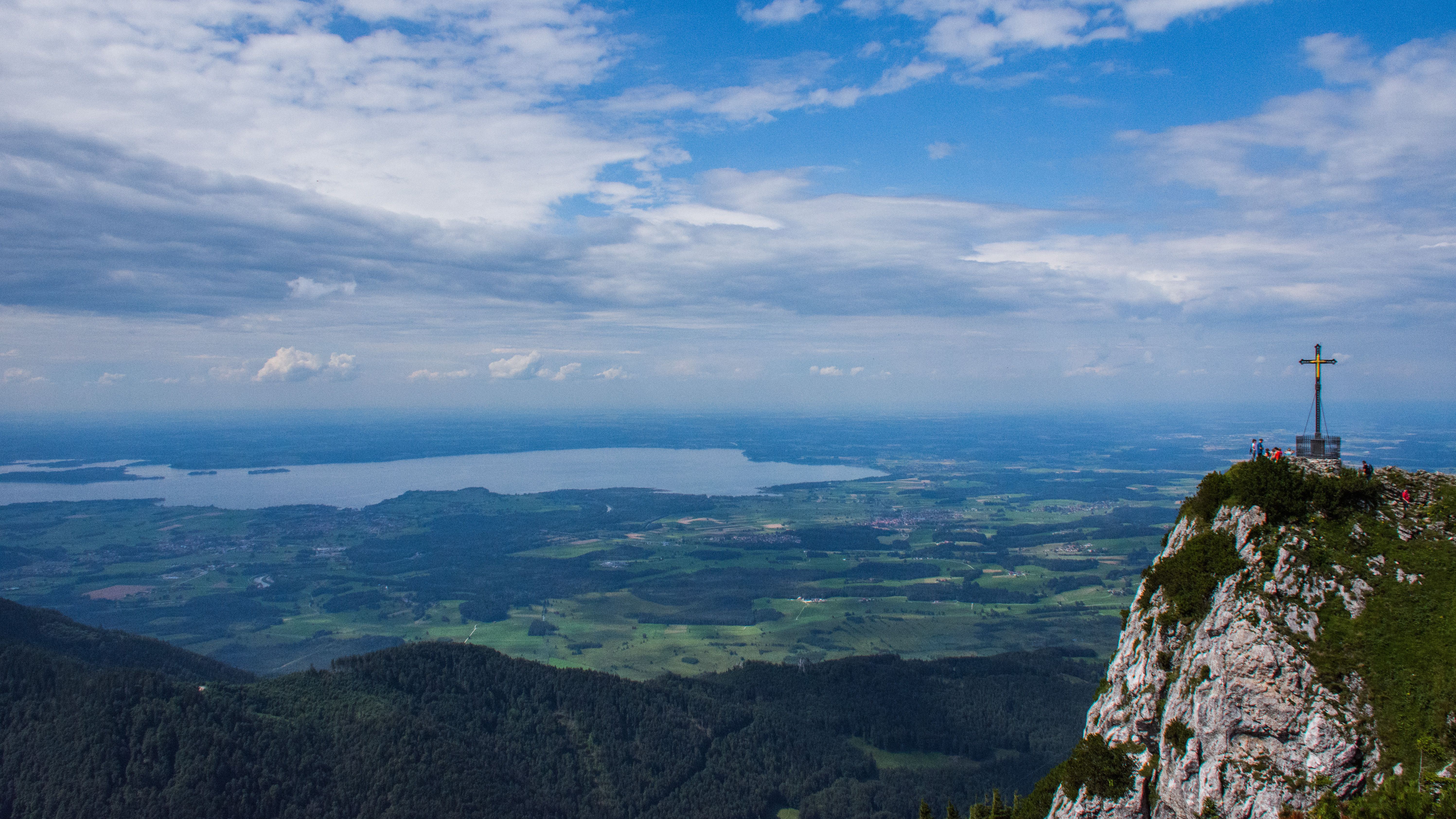 Een paar honderd meter voor de top, ga je over de bergrug heen. Hier word je plotseling geconfronteerd met kilometers na kilometers aan Alpentoppen, de een nog hoger dan de ander. Een panorama om voor te blijven wonen. Maar de echte top vind je even verderop, met een kerkje, een schuilplek voor slecht weer, een restaurant én het bergstation van de Seilbahnen Hochfelln. En het onvermijdelijke Gipfelkreuz. Met een 360° panorama over aan de ene kant Zuid-Duitsland en aan de andere kant de Tiroolse Alpenreuzen weet je niet waar je moet kijken!