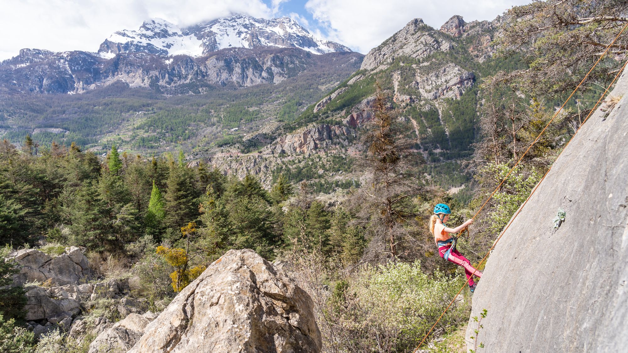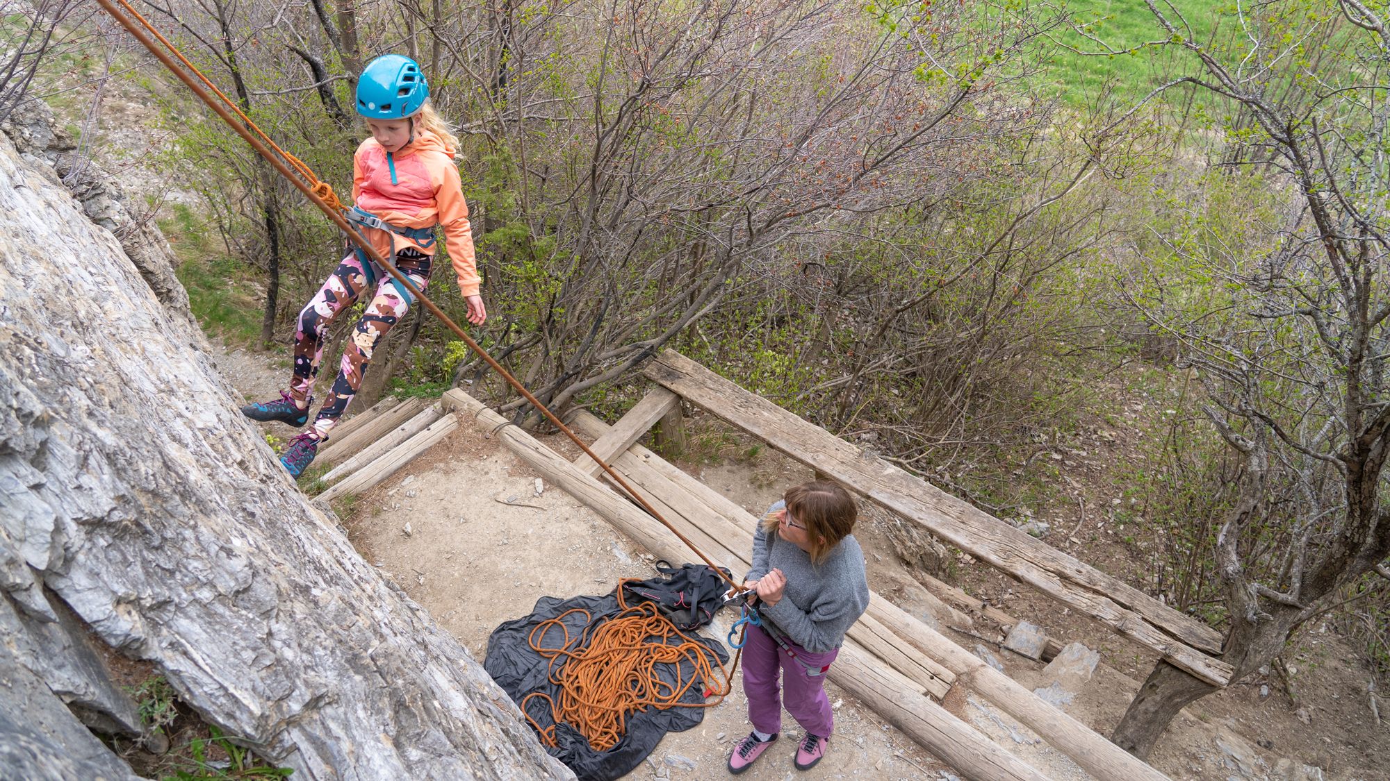 Bij de eerste keren rotsklimmen met erg jonge en lichte kinderen zou ik absoluut rotsklimroutes aanraden waar de kinderen van boven veilig naar beneden kunnen wandelen. Dat laat je kinderen natuurlijk niet alleen doen, maar samen met een volwassene. Het voordeel van deze rotsen is ook dat het aanleggen van een toprope heel eenvoudig is en snel gaat.