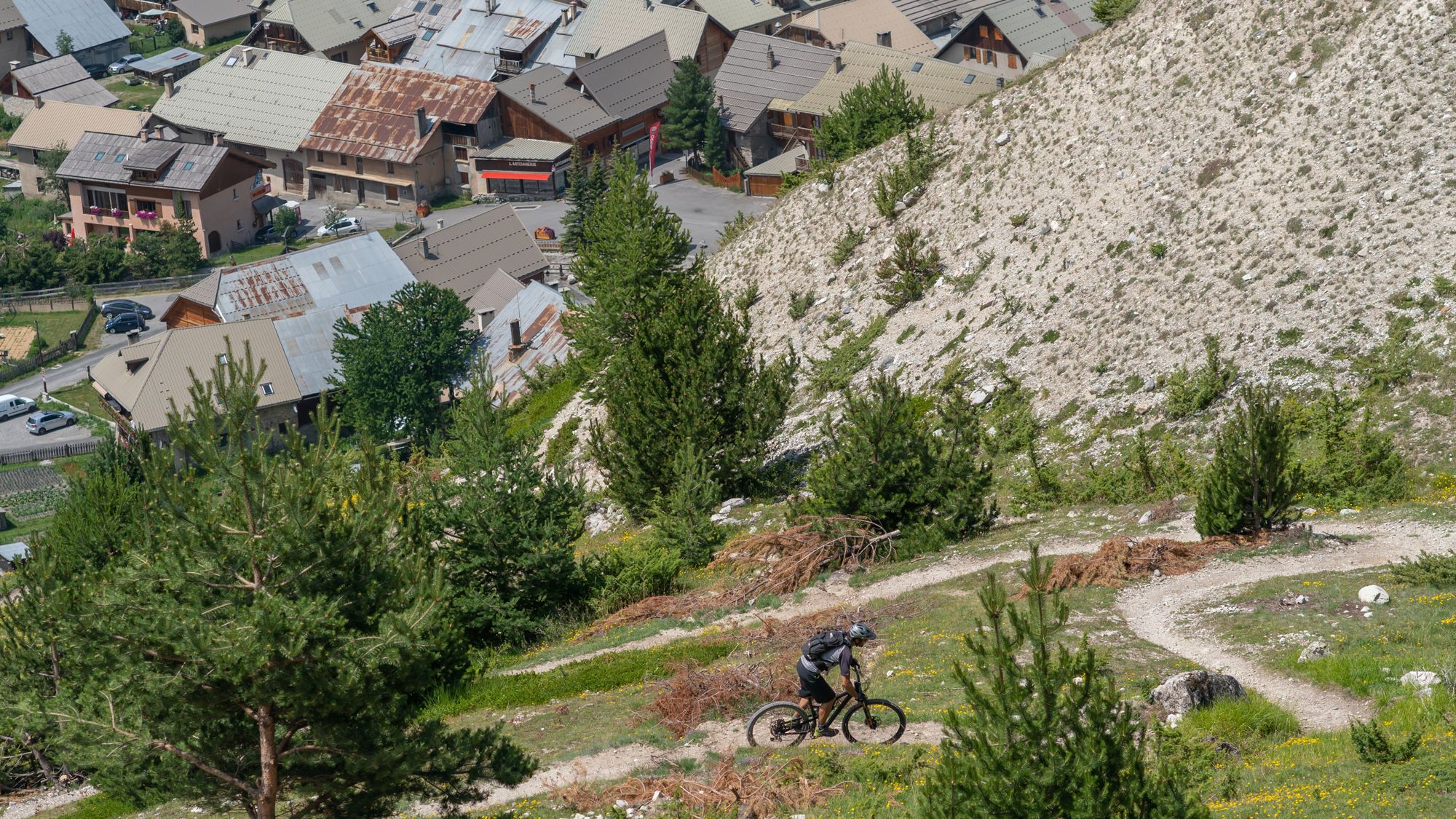 De afdaling begint met enkele hele pittige haarspeldbochten. Schrik niet, dit is de moeilijkste passage van de gehele afdaling. Een mooie bergachtige single brengt je naar de Col Fromage. Hier kun je eigenlijk alle paden pakken. Mijn aanrader: het pad wat naar links afbuigt. Deze is het minst steil en laat je daarom het langst profiteren van een fijne afdaling. Dit pad kruist na een lange speelse traverse het pad dat vanaf de Estronques naar beneden komt en brengt je daar met een aantal speelse bochten naar het dal. Eenmaal bij Villard pak je de onverharde weg die links omhoog gaat richting het parapente-grasveld. Net na dit grasveldje draait een leuke single naar rechts richting Ceillac en je startpunt. Hou op dit pad links aan in de afdaling dan heb je het langste plezier van dit pad. Dit is echt de kers op de taart!