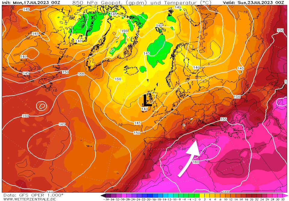 In de loop van het weekend kantelt de stroming naar het zuidwesten en kan opnieuw zeer warme lucht de Alpen gaan bereiken. In hoeverre dat uit de verf komt en voor hoe lang moeten we nog even afwachten, maar er ligt een indrukwekkend warmtebastion klaar boven Noord-Afrika en de Italiaanse eilanden Sicilië en Sardinië. Er is weinig voor nodig om die luchtmassa in beweging te krijgen.
