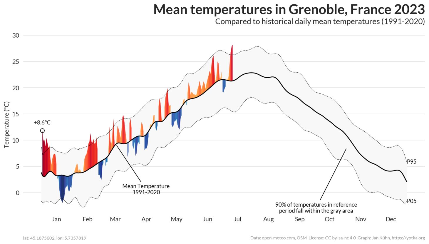 In de grafiek met de temperatuurafwijkingen dit jaar in Grenoble (F) zien we dat er vanaf half mei een einde kwam aan een wat koelere periode en we sindsdien voortdurend boven de normale waarde voor de tijd van het jaar zitten. Deze week blijft dat zo, al gaan de scherpste kantjes van de hitte er na dinsdag tijdelijk af. Het blijft wel warm met dagelijks 24 tot 30 graden in de dalen en er kunnen in de loop van de dag enkele buien vallen, soms met onweer. Ga je op pad houd de berichten en de luchten goed in de gaten. Hier geven we je een aantal tips hoe te handelen bij onweer in de bergen.
