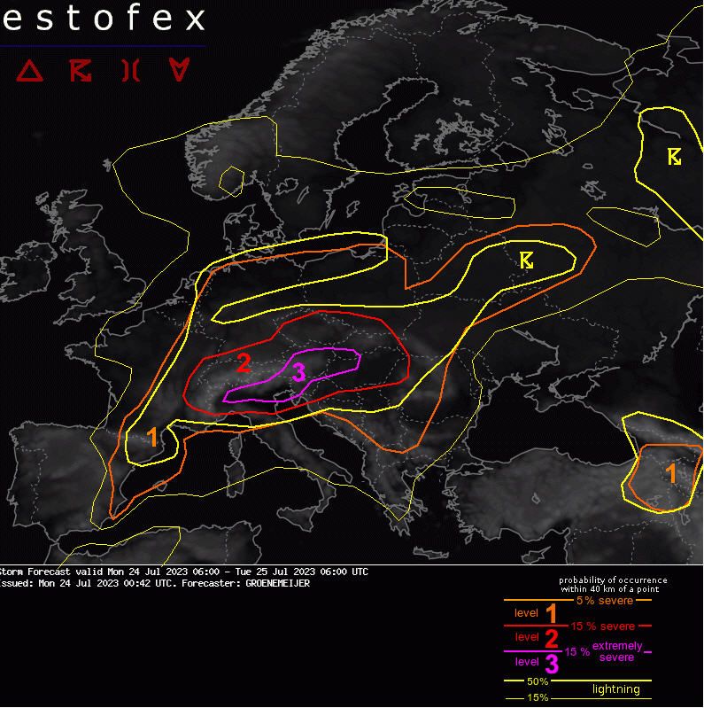 We beginnen vandaag met zware onweersbuien met alle mogelijke randverschijnselen. Denk aan hagel, windstoten en overvloedig veel regen. Estofex, een platform dat waarschuwingen uitgeeft voor gevaarlijk weer, komt regionaal zelfs met een level 3 op de proppen. Dat is het hoogste waarschuwingsniveau wat tot dinsdagochtend van kracht blijft.