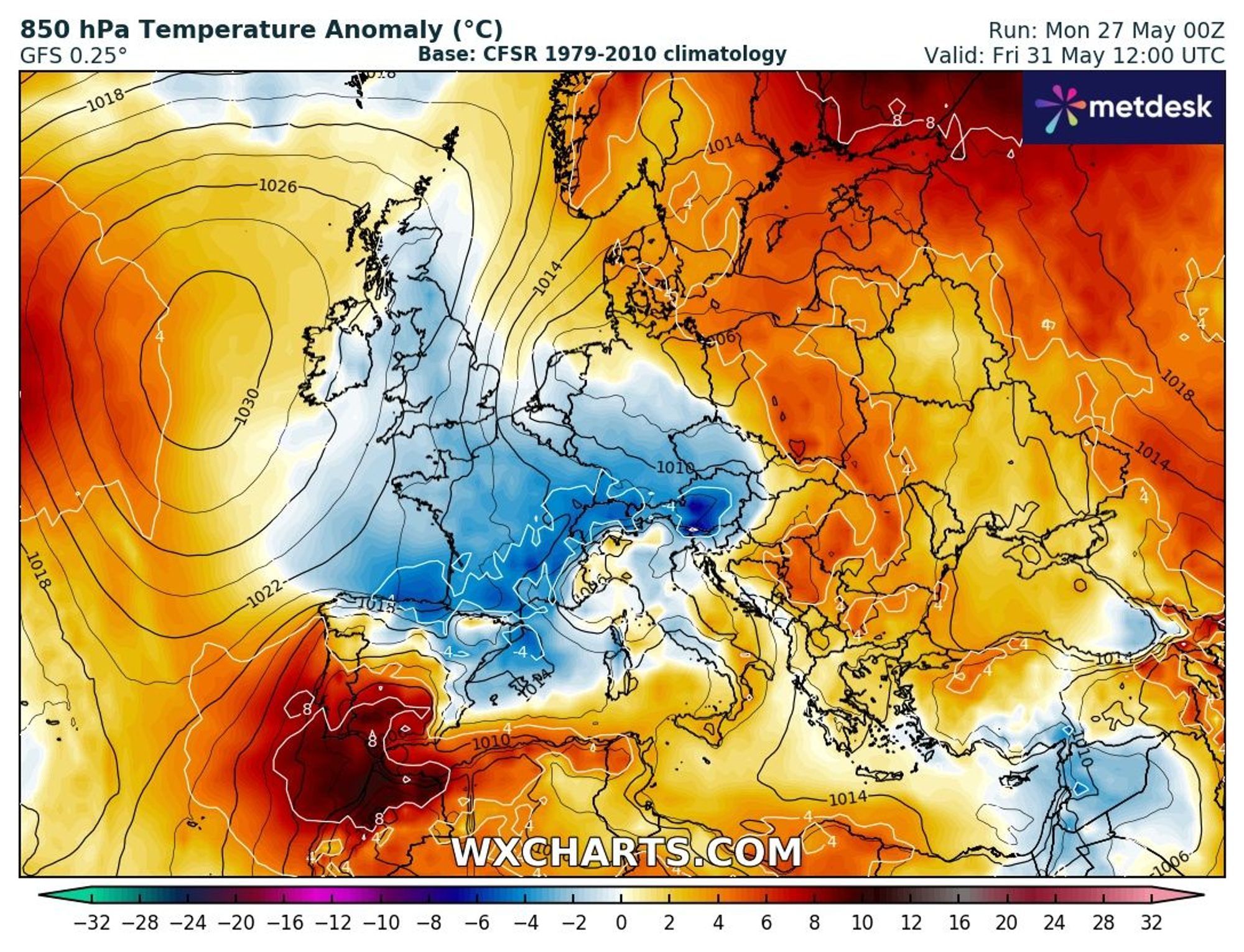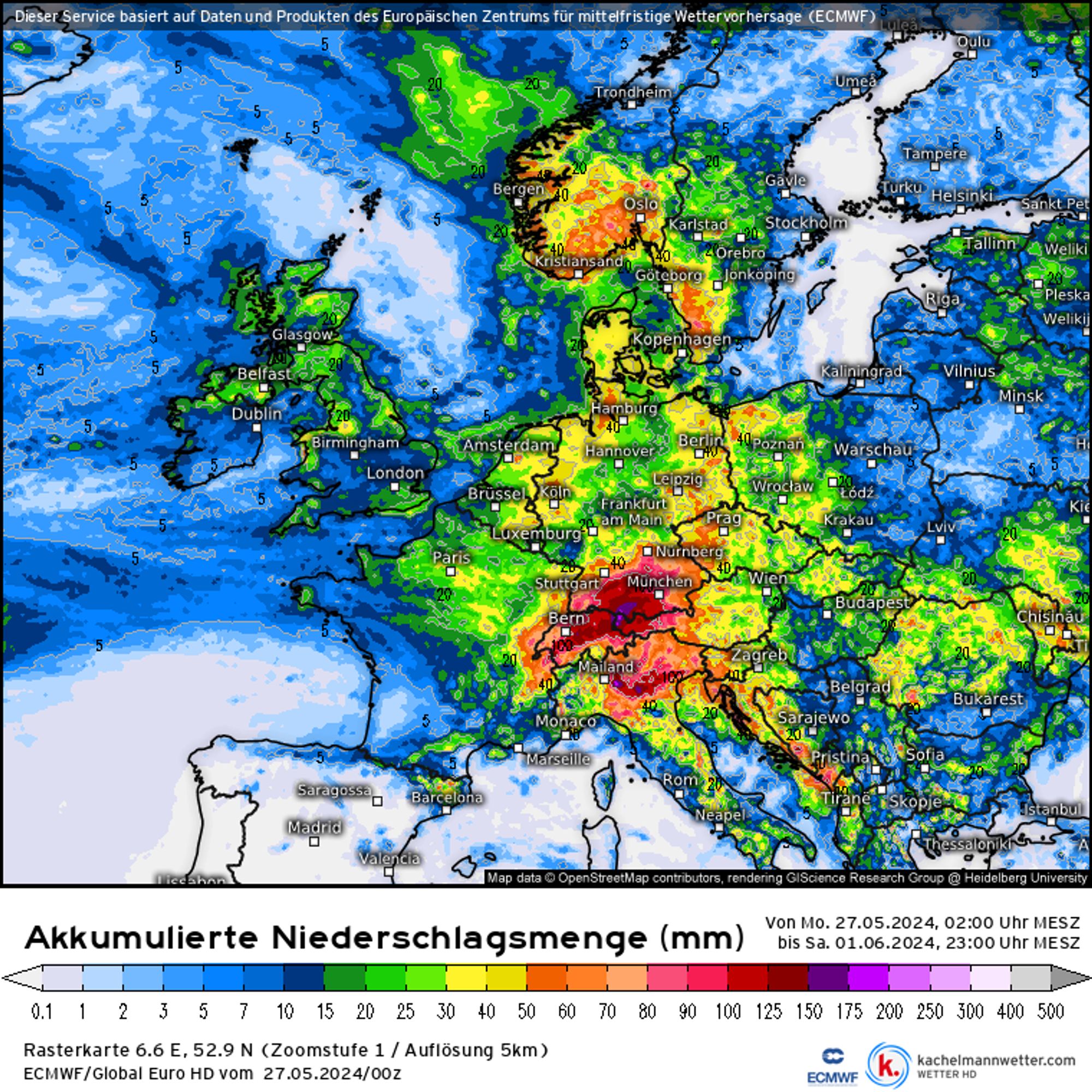 Donderdag breekt er ook een zeer natte fase aan. Zijn het donderdag vooral plaatselijke buien die voor veel neerslag kunnen zorgen; vrijdag regent het op uitgebreide schaal hevig in grote delen van de Alpen. Er nestelt zich dan een actieve storing boven Noord-Italië die aan de zuidkant van de Alpen voor zware regenval gaat zorgen, maar ook elders valt regen. Er kan zelfs een verscholen onweersbui tussenzitten en er is sneeuw mogelijk vanaf zo’n 2000 meter. Zaterdag draait de neerslag tegen de noordkant van de Alpen met de meeste regen dan in Vorarlberg, het westen van Tirol en delen van Zwitserland. In Italië en Frankrijk verwacht ik dan juist meer zon.