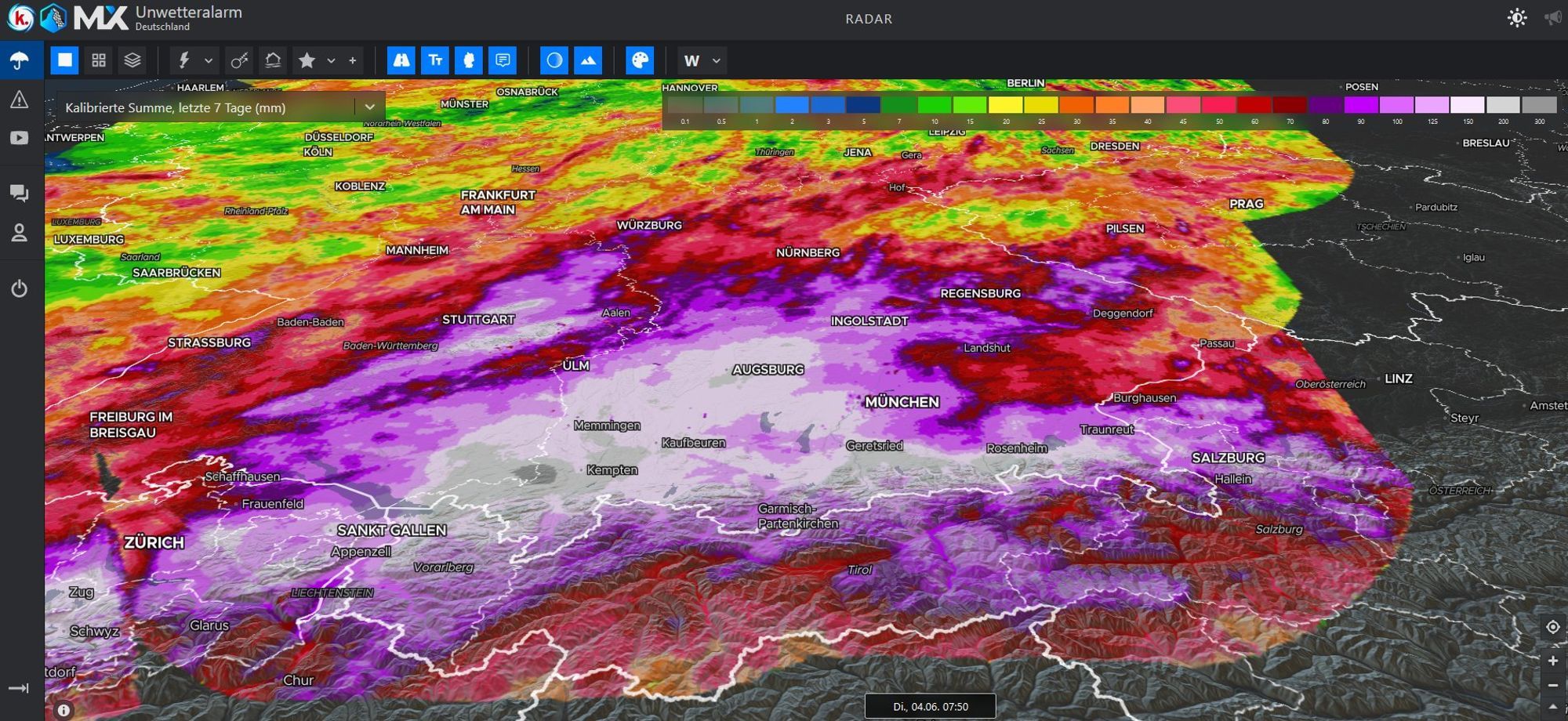 De afgelopen dagen is het veelvuldig in het nieuws geweest: de overstromingen in Zuid-Duitsland. Grote delen van de Alpen kregen ook veel regen, maar geluk bij een ongeluk was voor deze gebieden dat het zwaartepunt iets ten noorden van de Alpen lag. In het zuidwesten van Beieren viel plaatselijk meer dan 300 millimeter in zeven dagen tijd! Het Oostenrijkse Vorarlberg kreeg hier ook een flinke veeg van mee.