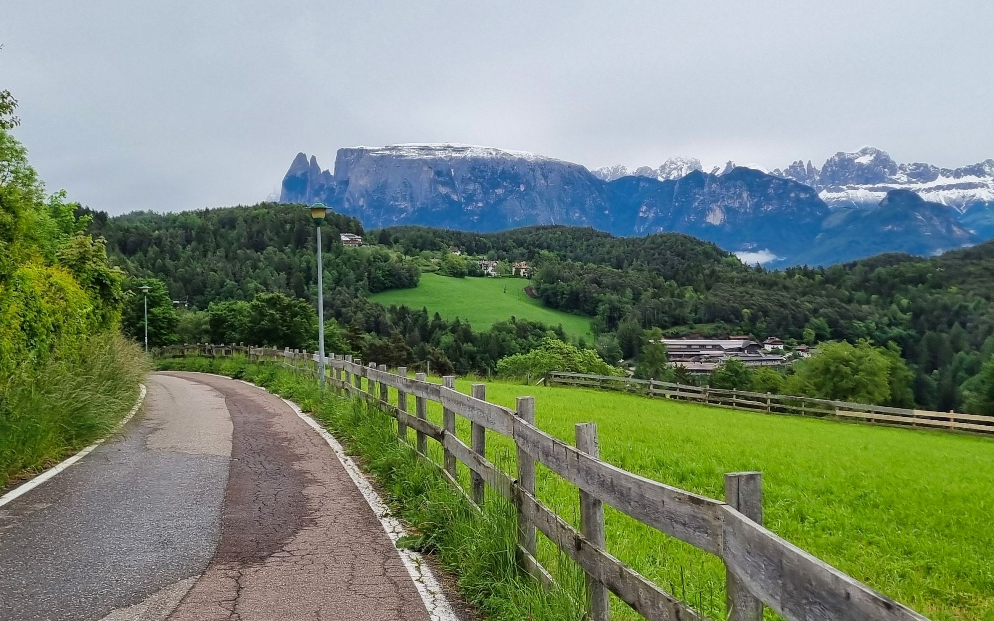 We komen lager en lager en het wordt steeds warmer, als we weer zo’n mooi plekje tegenkomen. Het dorpje Sankt Magdalena is weinig meer dan een gehucht met een eeuwenoud kerkje in een prachtig landschap dat volledig gedomineerd wordt door druivenstruiken, cypressen en andere mediterrane begroeiing. Vroeger liep hier de Rittner Bahn, een oud spoorlijntje dat tussen Bozen en Oberbozen liep. Door de bouw van de eerste gondel in 1966 is dat spoor overbodig geraakt, maar er is nog een restant waar nog wel treintjes rijden, tussen Oberbozen en Klobenstein. Nu een echte toeristische trekpleister.