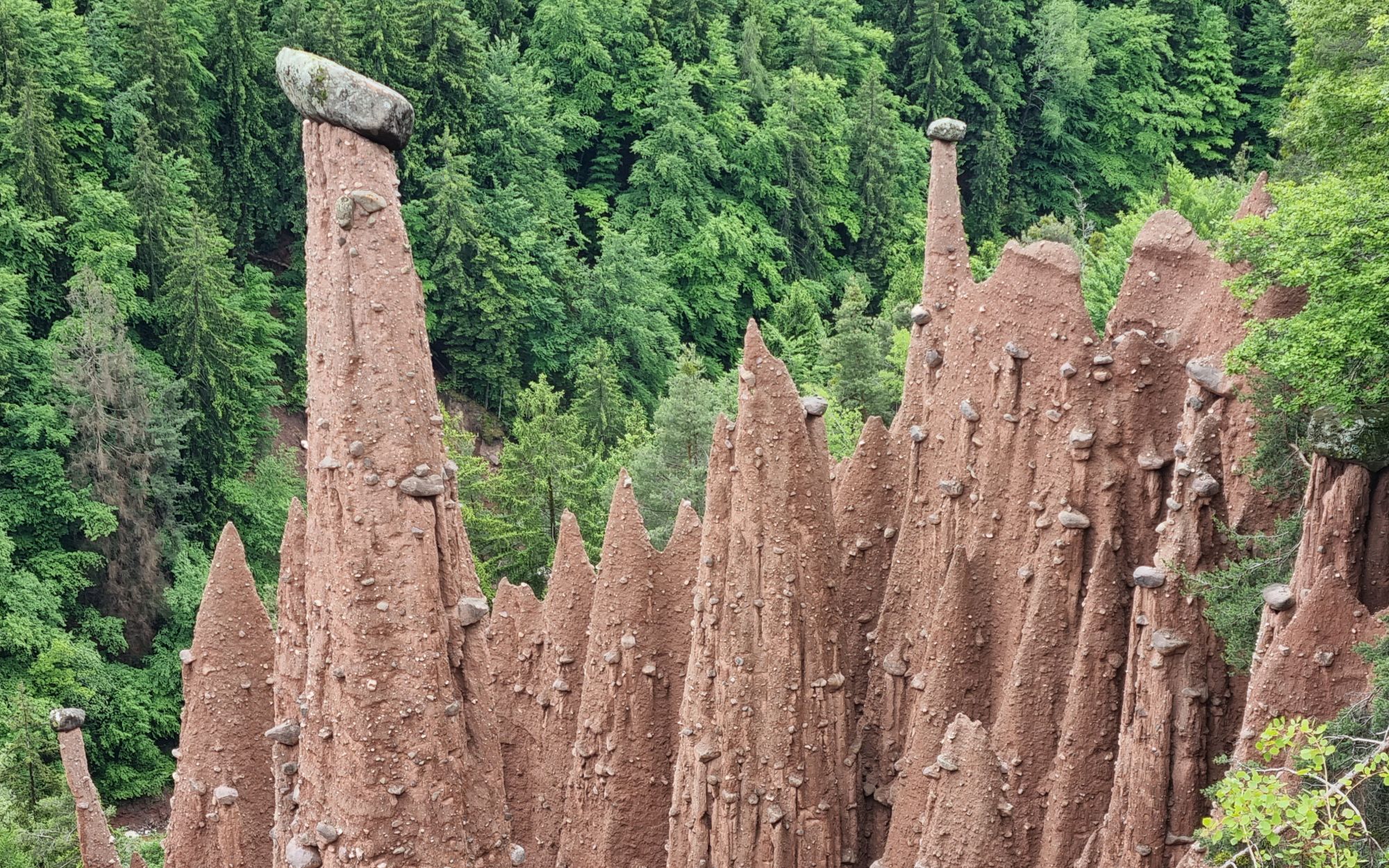 Al snel lopen we tussen bomen en langs watervallen die het vele regenwater van de afgelopen weken afvoeren richting dal. Tijdens het wandelen een geweldig decor, maar dat zijn de aardpyramides nog veel meer. Op onze route liggen de aardpyramides van ‘Katzengraben’, maar je hebt ze ook ter hoogte van de dorpjes Oberinn en Klobenstein. Die laatste staat bij schaatsers beter bekend onder de Italiaanse naam Collalbo vanwege een schaatsbaan. Op onze route heb je trouwens verschillende uitzichtpunten op de aardpyramides en soms kun je ook heel dichtbij komen. Echt indrukwekkend.