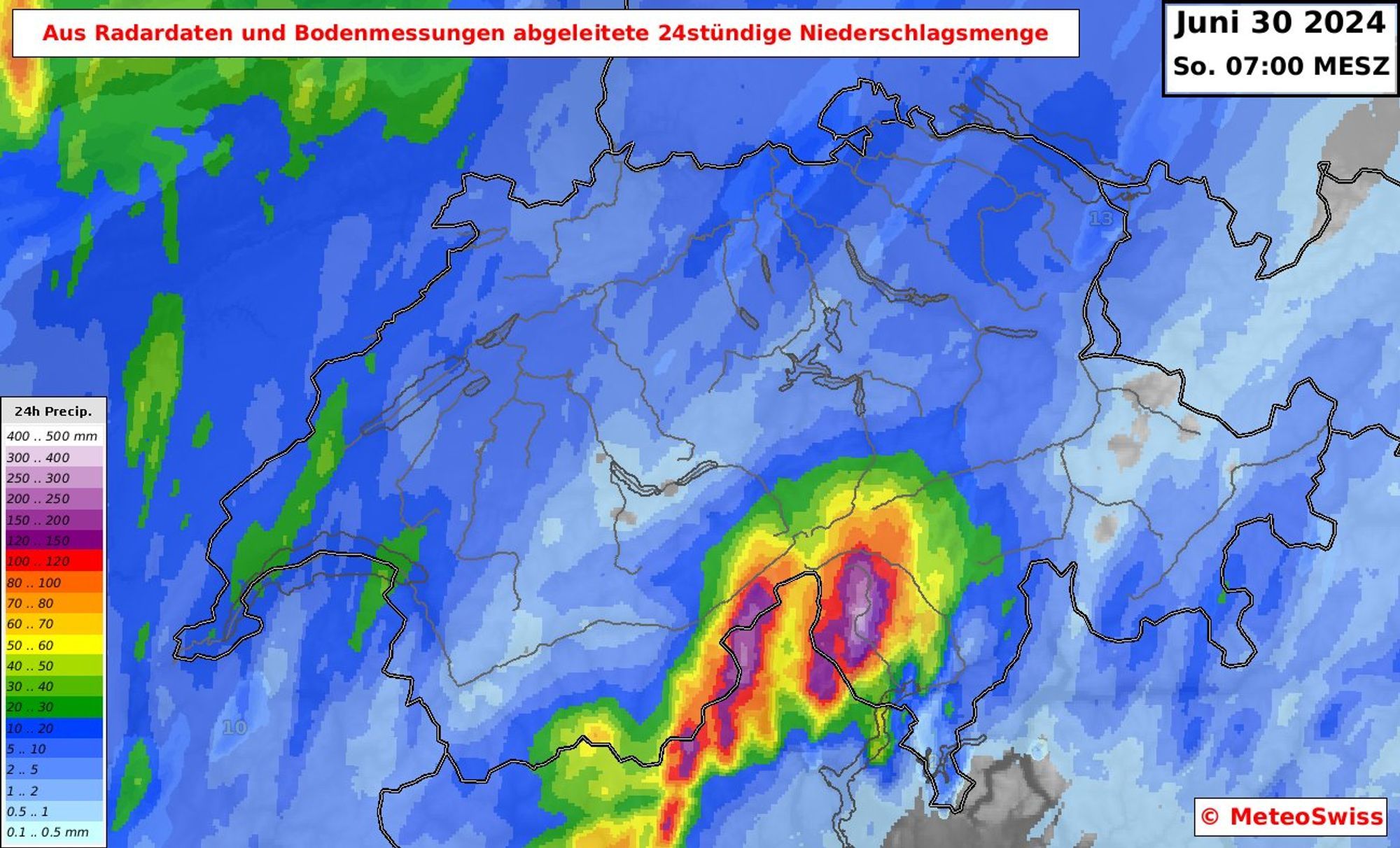 Gevallen neerslag in Zwitserland tussen za 7u en zo 7u. Bron: meteoschweiz.ch: