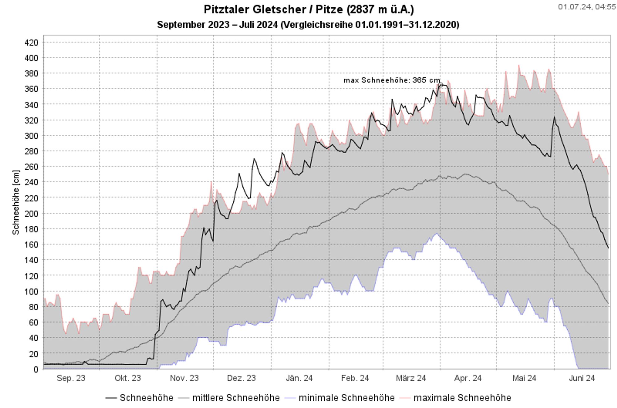 Na meerdere koele fasen was juni weer duidelijk warmer dan gemiddeld, waardoor de sneeuw in het hooggebergte versneld is gaan wegsmelten. Op de Sonnblick in de Oostenrijkse Hohe Tauern lag op 5 juni nog 415 cm sneeuw. Gisteren was daar nog 230 centimeter van over. Oftewel, in nog geen maand tijd is er 185 centimeter weggesmolten. De grafiek van de Pitztaler Gletscher geeft eenzelfde beeld. Het laat (opnieuw) zien dat voor de gletsjers het verloop van de zomer veel bepalender is dan veel of weinig sneeuw in de winter en lente.