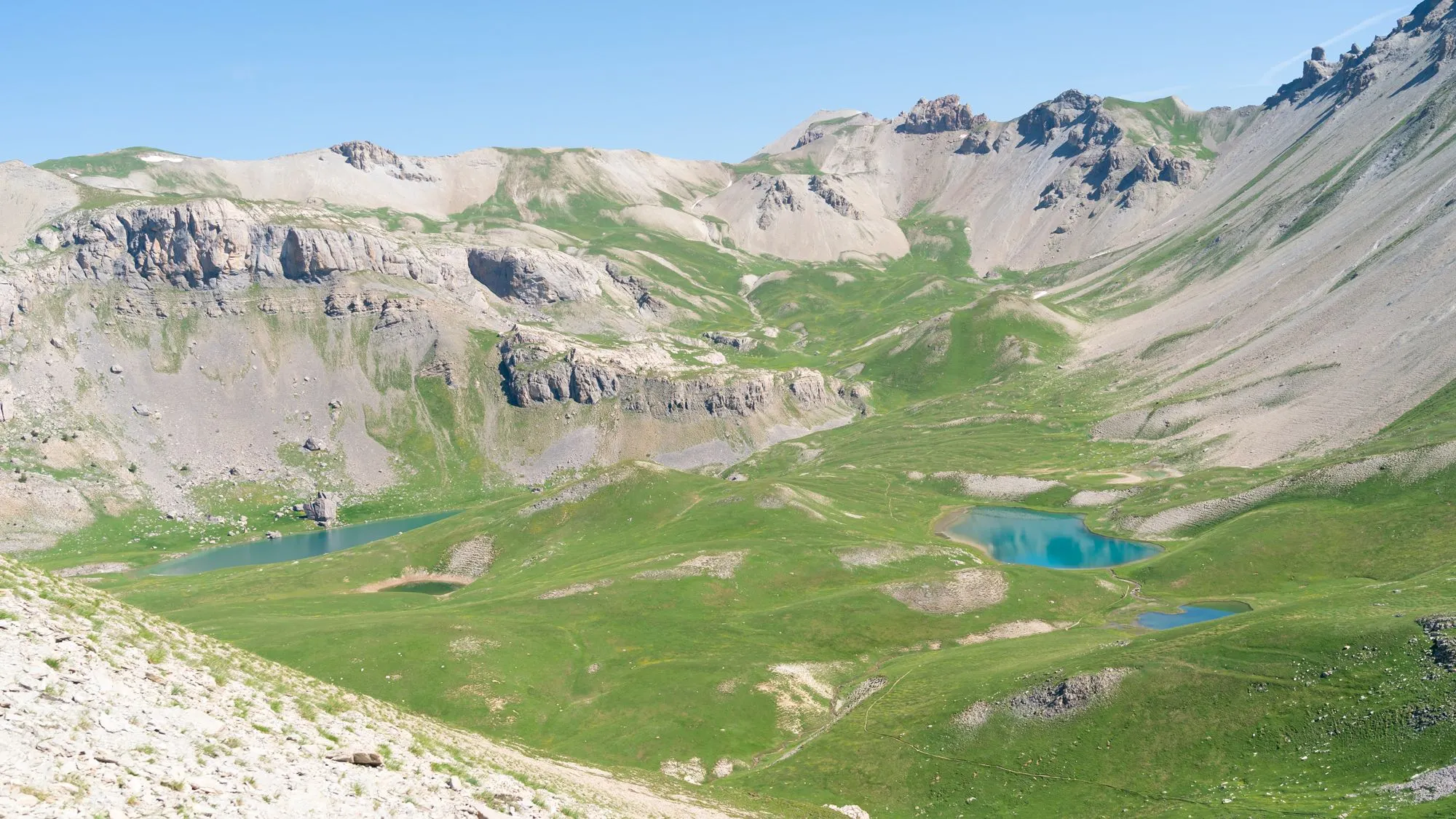 Na Lac de l’Ascension kom je nog langs twee andere meren: Lac d’Escur. Hoewel kleiner, zijn deze meren net zo mooi. Misschien wel mooier. Daarna volgt een steile klim naar de Collet du Peyron. Vergeet niet om hier achterom te kijken, want het uitzicht op de verschillende meren is schitterend. Vanaf de Collet du Peyron volgt een lange afdaling tot je weer terugkomt op het karrespoor.