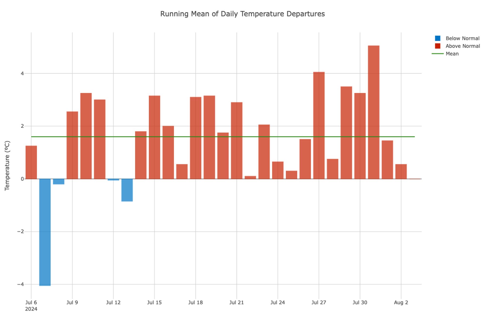 Hieronder een grafiek met de temperatuurafwijking in Mayrhofen (A) ten opzichte van het gemiddelde uit de periode 1991-2020. Je ziet dat de afgelopen 30 dagen duidelijk warmer waren dan normaal, met afgelopen week als uitschieter. Afgelopen woensdag (31 juli) was het liefst 5,5 graad warmer dan gebruikelijk. In de Zuid- en West-Alpen waren de uitschieters zelfs nog groter. Daarmee gaat deze zomer zich moeiteloos in het rijtje van zeer warme zomers scharen, dat is nu al bijna zeker.