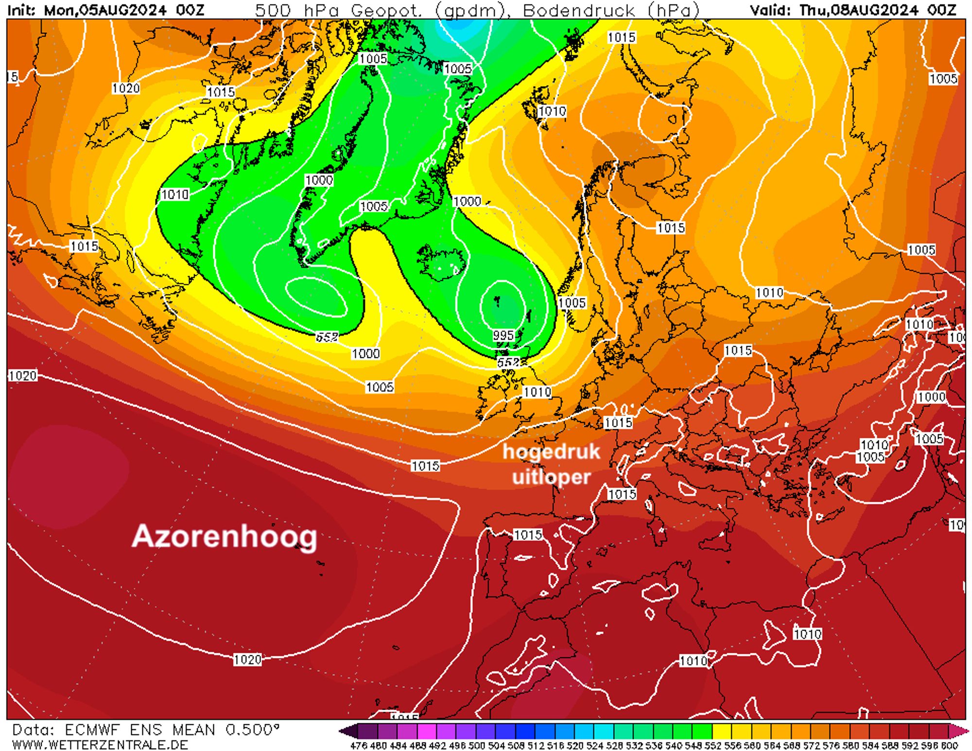 In dit beeld komt nog weinig verandering. De laatste weken zien we uitlopers van het hogedrukgebied dat bij de Azoren ligt, voortdurend doorschuiven naar Midden-Europa. Dat is geen automatisme, we hebben in het verleden veel zomers gehad waarin dit systeem honkvast was en oceaanstoringen telkens tot Midden-Europa konden doordringen. Het gevolg was dan sterke wisselvalligheid. Die wisselvalligheid bevindt zich nu een stuk noordelijk op de kaart, terwijl de Alpen dus overwegend warm en vrij zonnig zijn.
