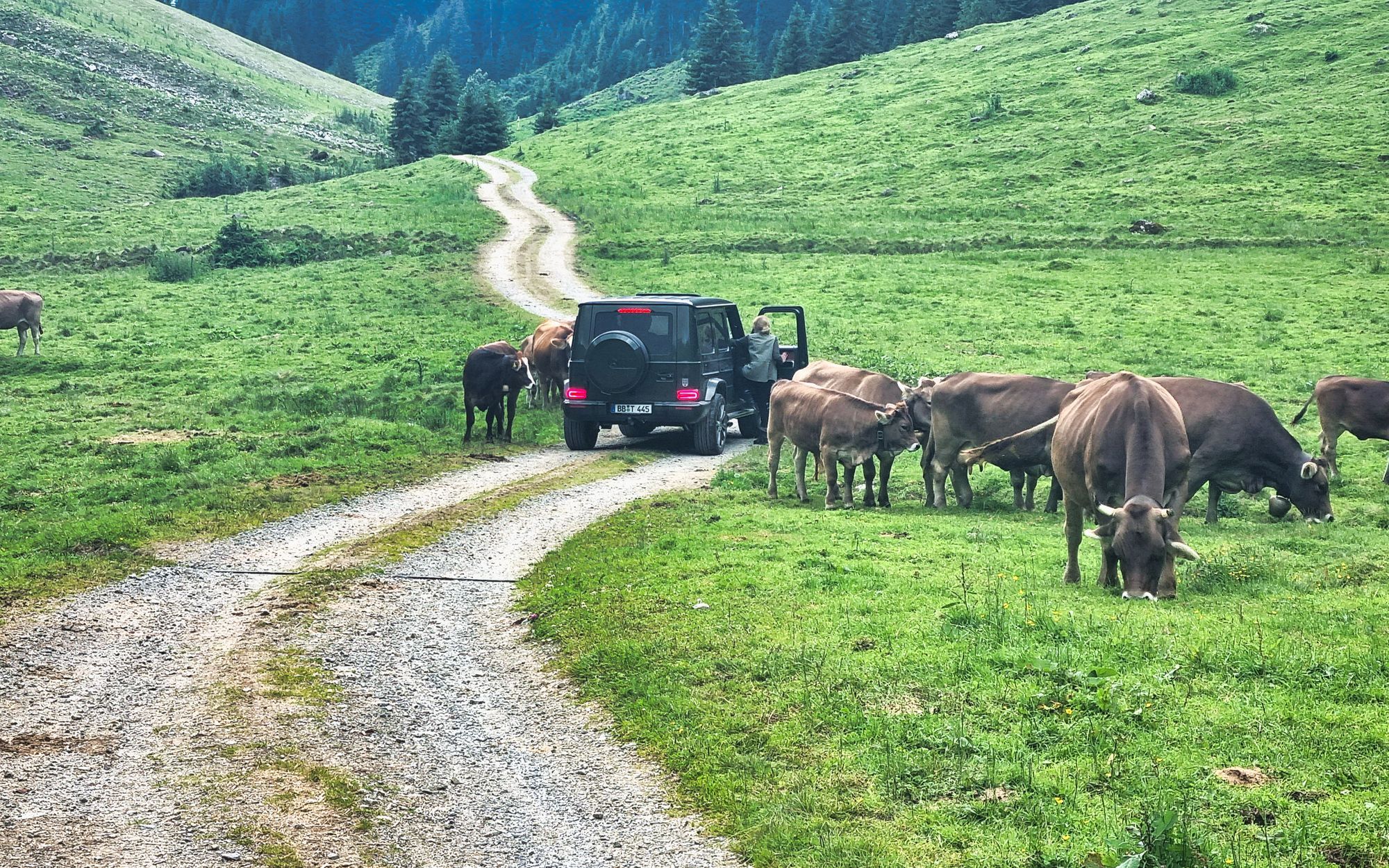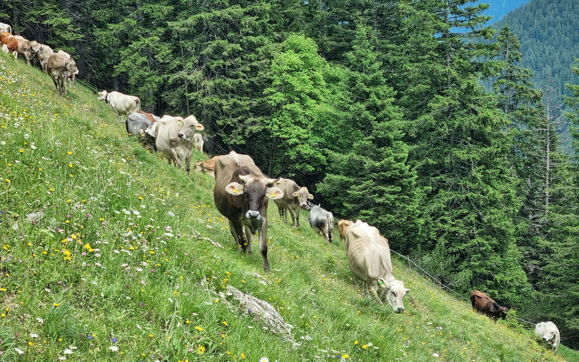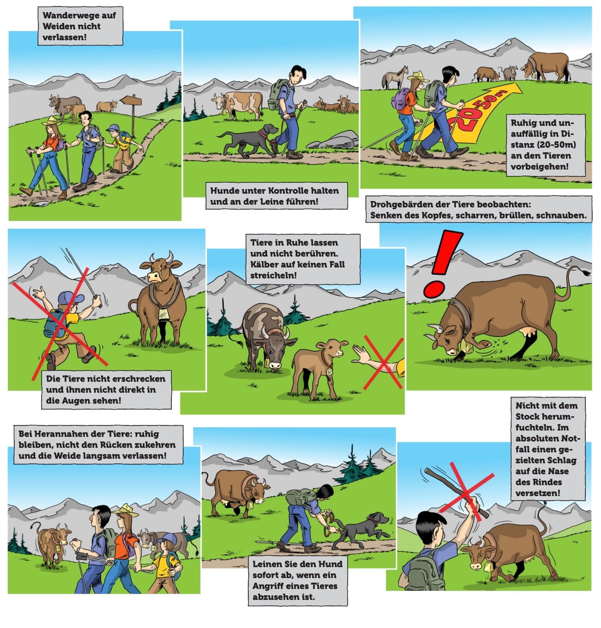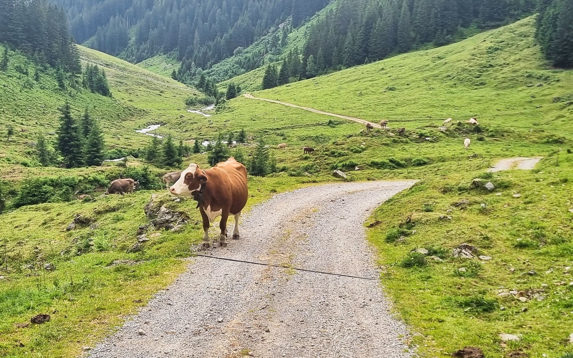 Wanneer je over een Alpenweide wandelt, is het belangrijk voldoende afstand tot de koeien te bewaren. Probeer zoveel mogelijk op het aangegeven pad te blijven, maar als de situatie daarom vraagt, is een omweg beter. Honden moeten altijd aan de lijn blijven, tenzij koeien agressief worden — dan is het veiliger om de hond los te laten, zodat hij kan vluchten.