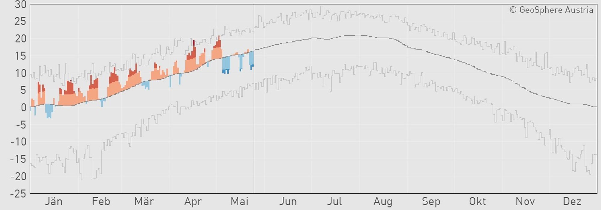 In april 2023 lag de gemiddelde temperatuur in Innsbruck 1,3 graad beneden het langjarig gemiddelde. Dat was de laatste keer dat de Alpenstad een maand had waarin de temperatuur lager lag dan het gemiddelde uit de periode 1991-2020 (bron). Bijna twee jaar later gaat dit opnieuw gebeuren. Mei ligt namelijk een hele graad achter op waar we recht op hebben (zie grafiek) en met de vooruitzichten voor deze week gaat dat niet meer goedgemaakt worden.