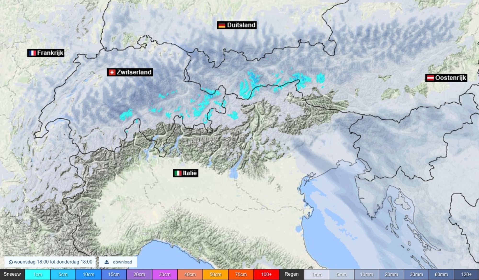 Anders wordt dat dus aan de noordkant van de Alpen. Vooral van woensdag op donderdag is het bewolkt en gaat er veel regen vallen. In delen van Zwitserland en Oostenrijk gaat het plaatselijk om meer dan 50 mm. Hier de berekende 24-uur-neerslag vanaf woensdag 18.00 uur: