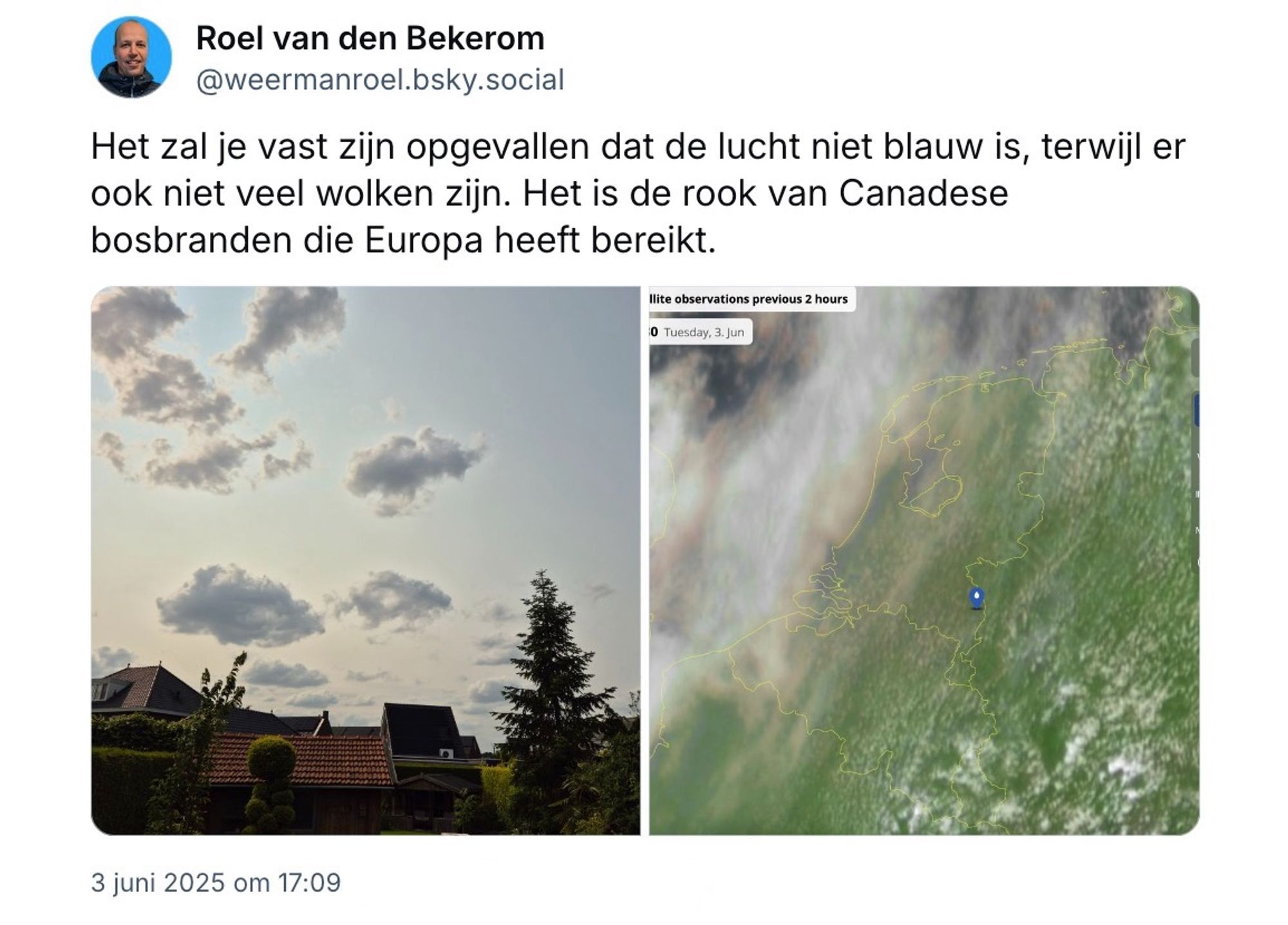 Tussen de buien door had de Benelux de afgelopen week ook al geen blauwe luchten meer. Zie mijn berichten op Bluesky hierover. De Alpen zijn dus ook ten prooi gevallen aan de roetdeeltjes van Canadese branden. Het is de rook van immense bos- en natuurbranden die al geruime tijd in Canada woeden en met de westelijke straalstroom naar Europa zijn getrokken. Opvallend trouwens hoe weinig aandacht hiervoor in Nederland is geweest, want je hoefde maar naar lucht te kijken om te zien dat er iets vreemds aan de hand is.