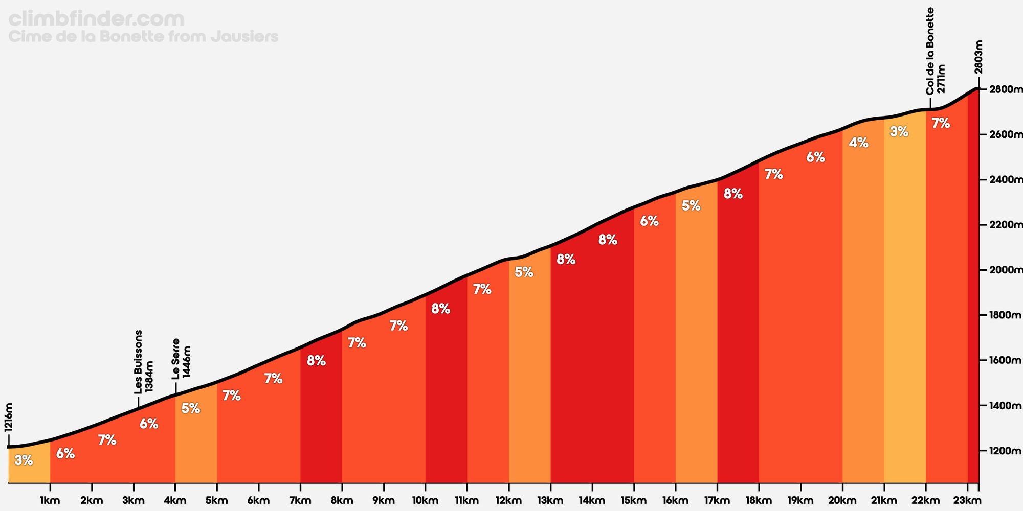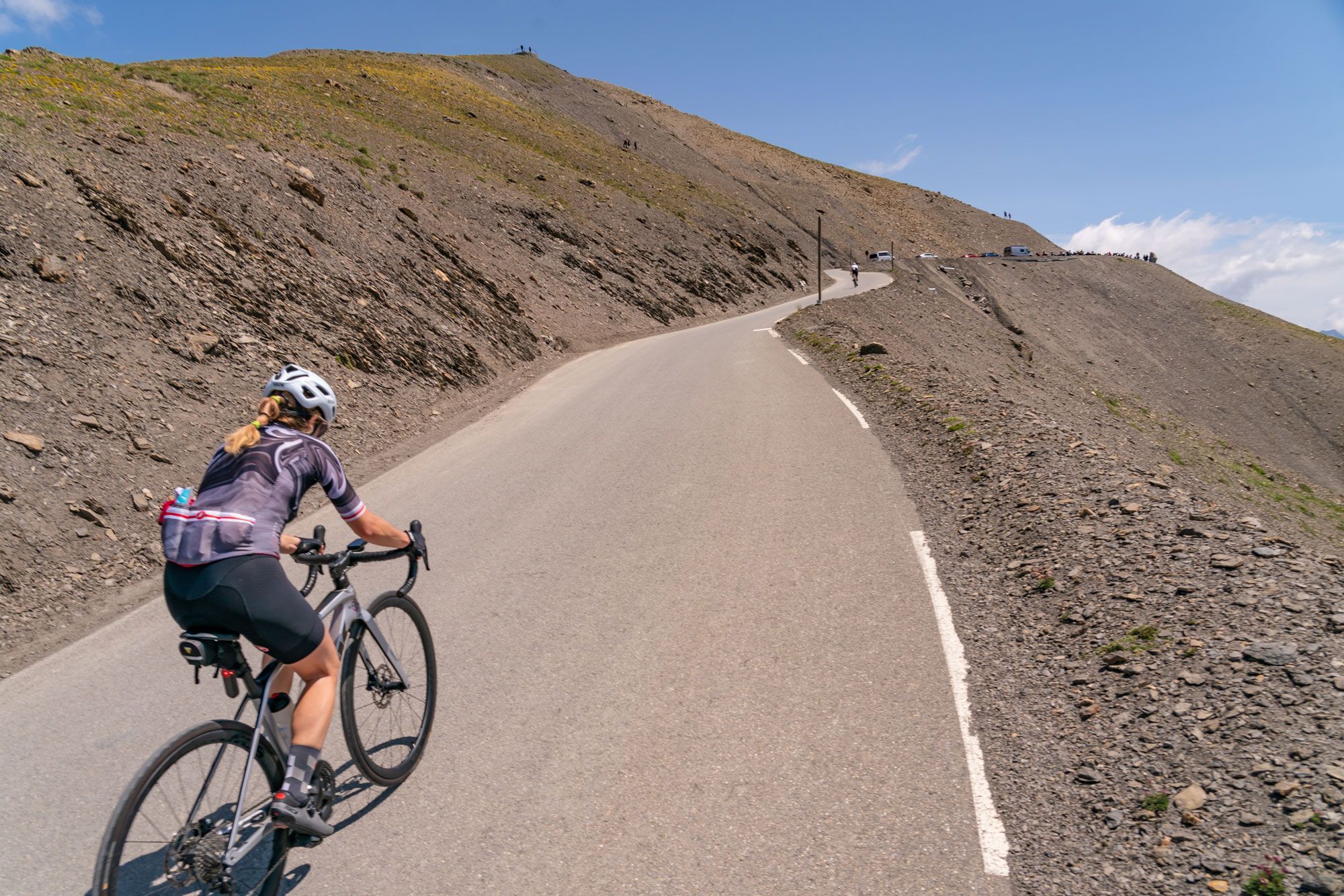 Bovenop deze col begint nog een lus van 2 kilometer: een geasfalteerde weg die om de top heen draait en eindigt op het hoogste punt: de Cime de la Bonette, op 2802 meter. Deze lus is aangelegd om van de Bonette de hoogste doorgaande geasfalteerde weg van Europa te maken. De Cime zelf is dus géén col in geografische zin, maar wel een indrukwekkend eindpunt van de klim. En die laatste 2 kilometer zijn niet mals: een lang stuk tegen de 12% voelt hier, op bijna 2800 meter hoogte, als een muur. Die ga je zeker voelen.