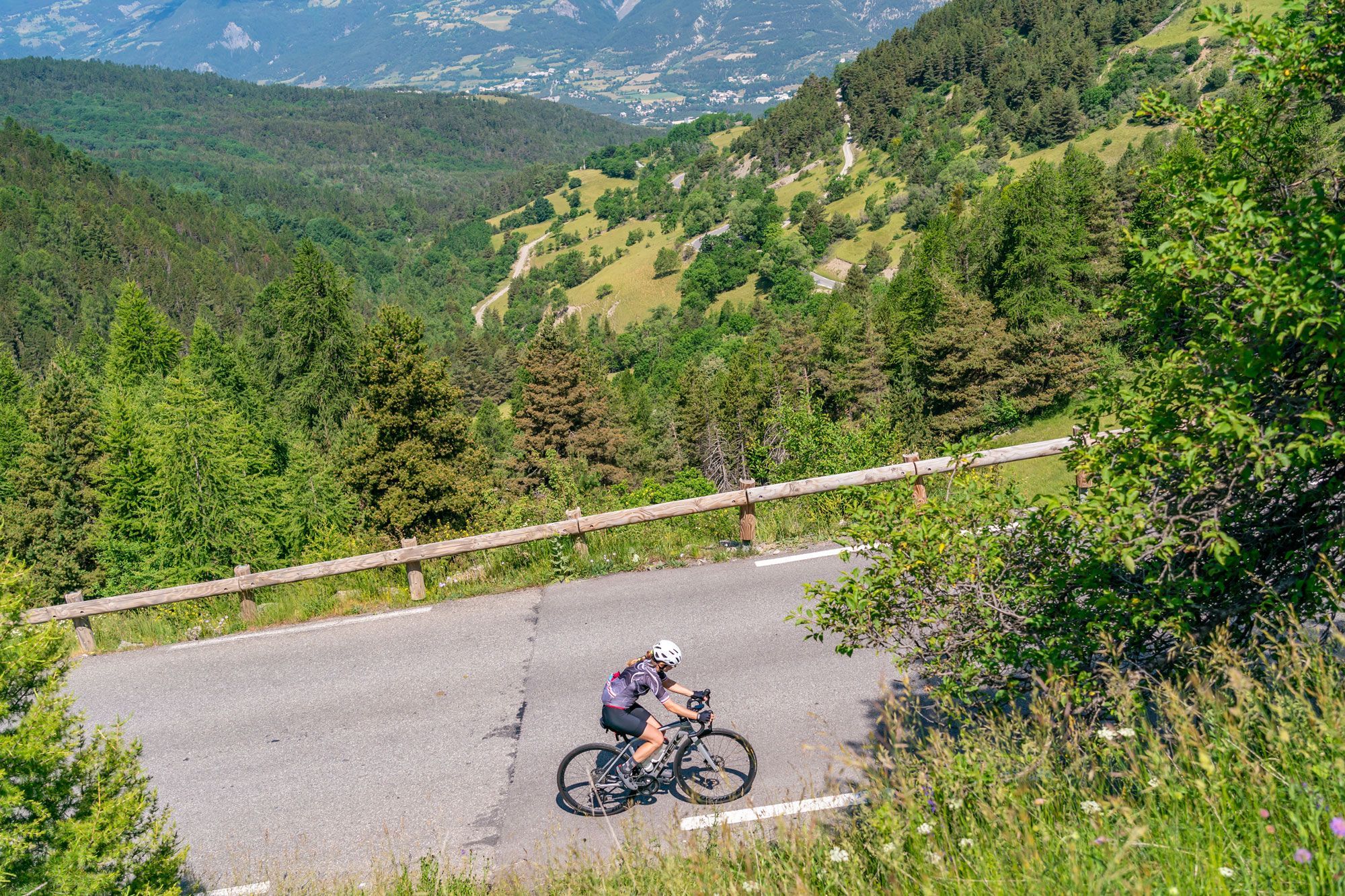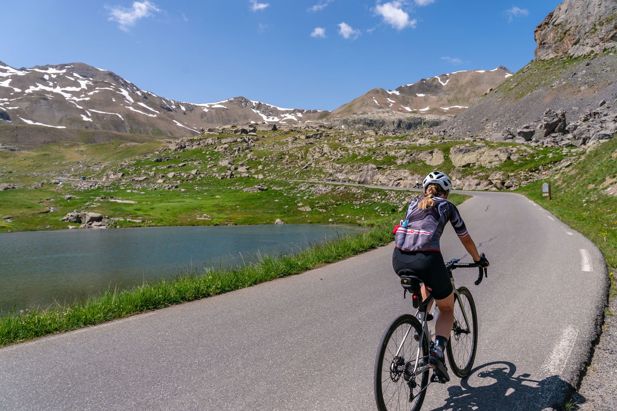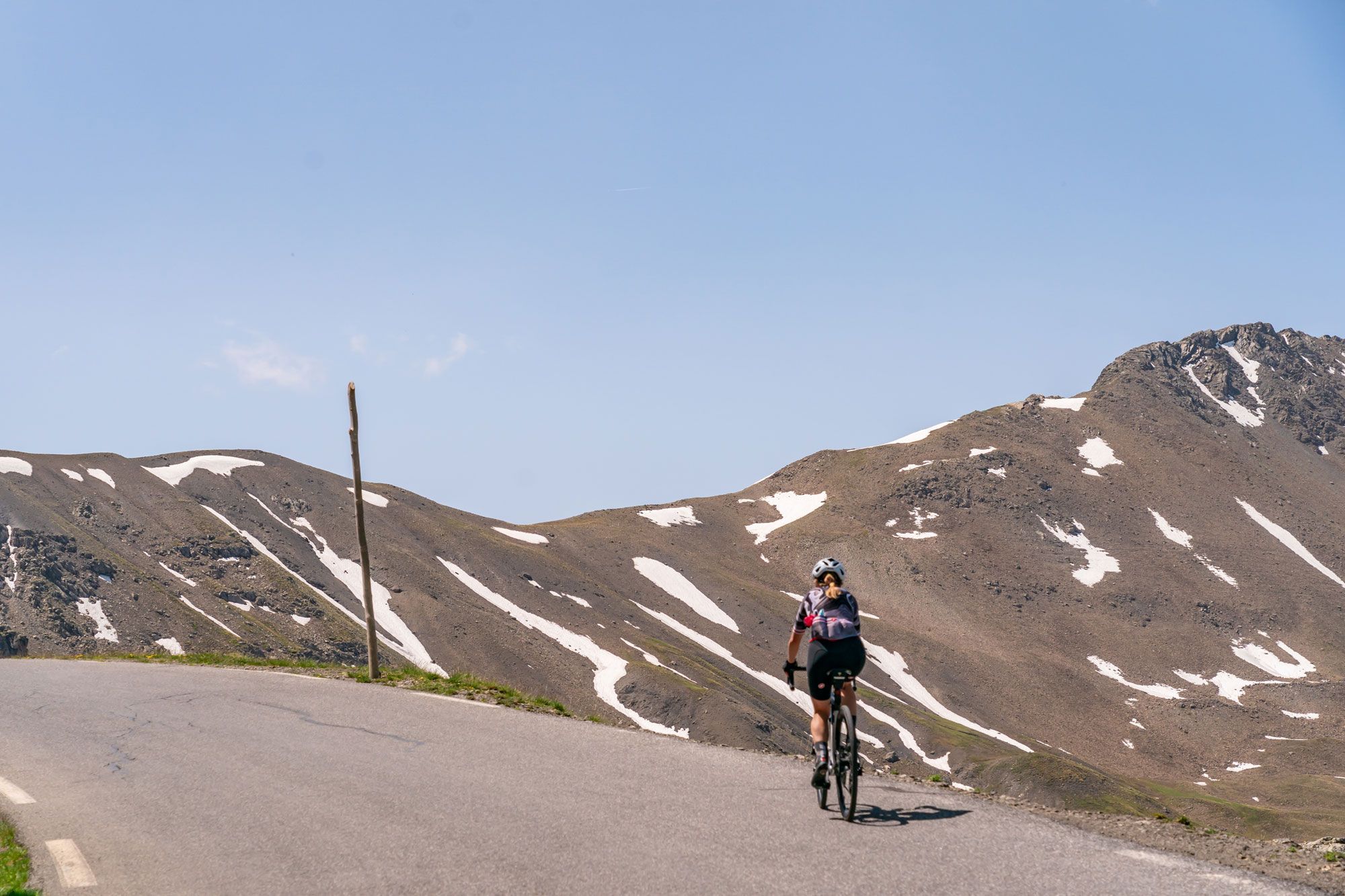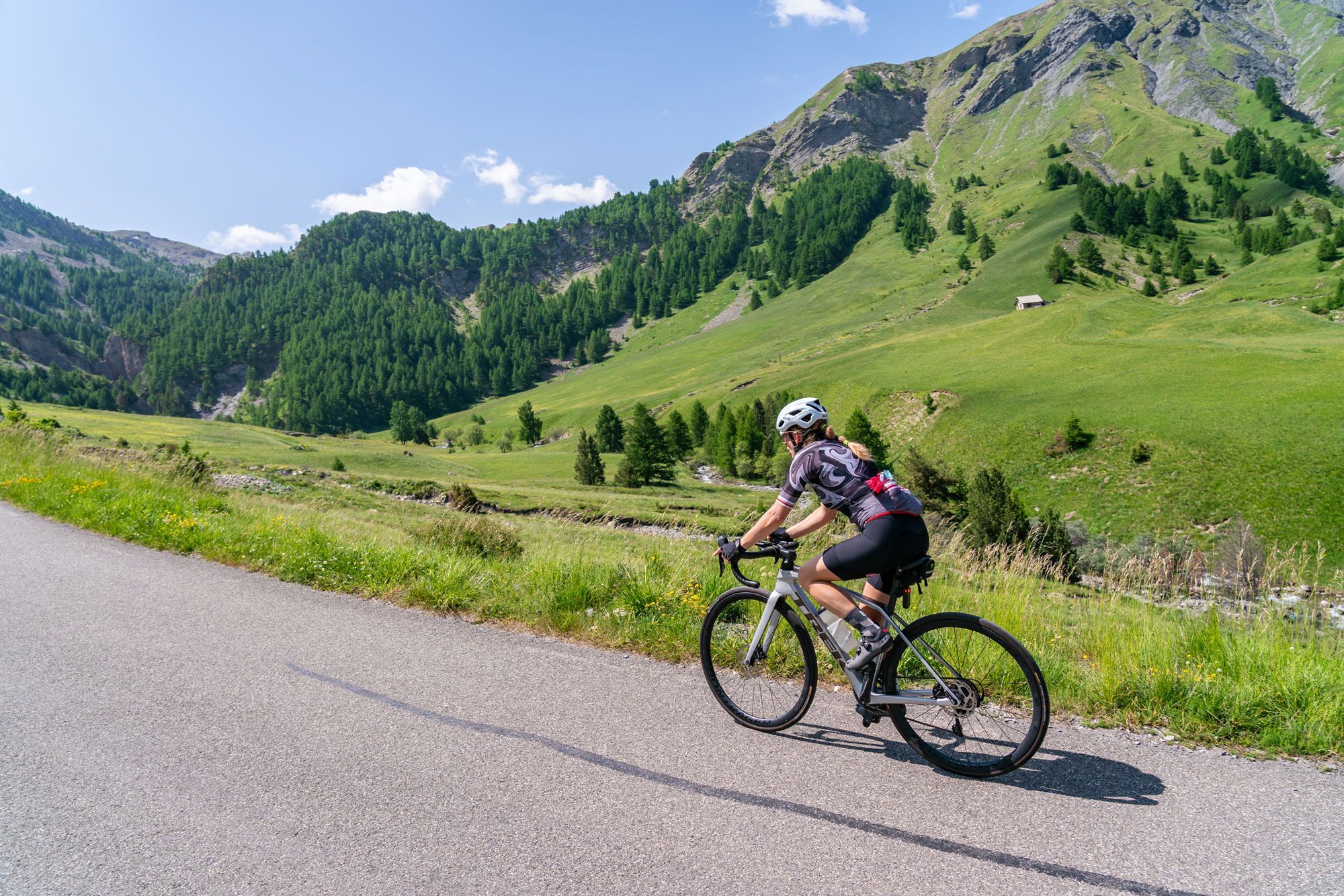 De klassieke klim begint in Jausiers, aan de noordkant van de berg. In het begin fiets je door glooiende alpenweides. De weg slingert omhoog: soms steil, soms vriendelijker, maar vlak wordt het nooit. Je passeert een dorpje, en de begroeiing wordt steeds schaarser.