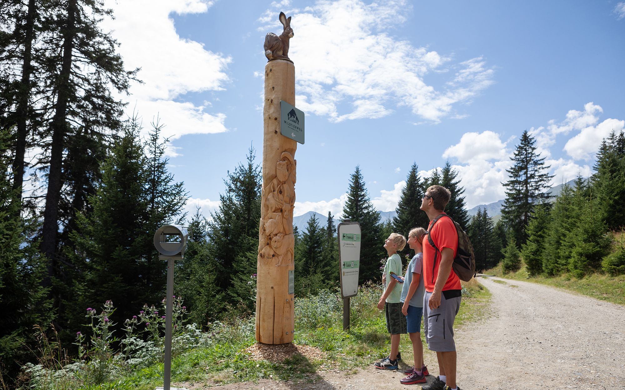 Stil, speels en vol verrassingen. De Wildtierweg in Fiss vormt een aanvulling op het veelzijdige aanbod van Serfaus-Fiss-Ladis rond een nieuwe vorm van natuurbeleving. De ongeveer drie kilometer lange route start aan het middenstation van de Schönjochbahn en loopt van de Fisser Kraft- und Sinnesweg tot aan de Frommes Alp. De brede weg is ook geschikt voor kinderwagens en biedt onderweg voldoende plekken om even te rusten. Je hebt geen technische voorkennis nodig. Alleen de gratis Serfaus-Fiss-Ladis App op je smartphone. Langs het traject zorgen zelf ontworpen houders ervoor dat niet het apparaat, maar het landschap centraal staat. De digitale dierenwereld wordt naadloos toegevoegd. Hij opent nieuwe perspectieven, zonder de echte wereld te verdringen.