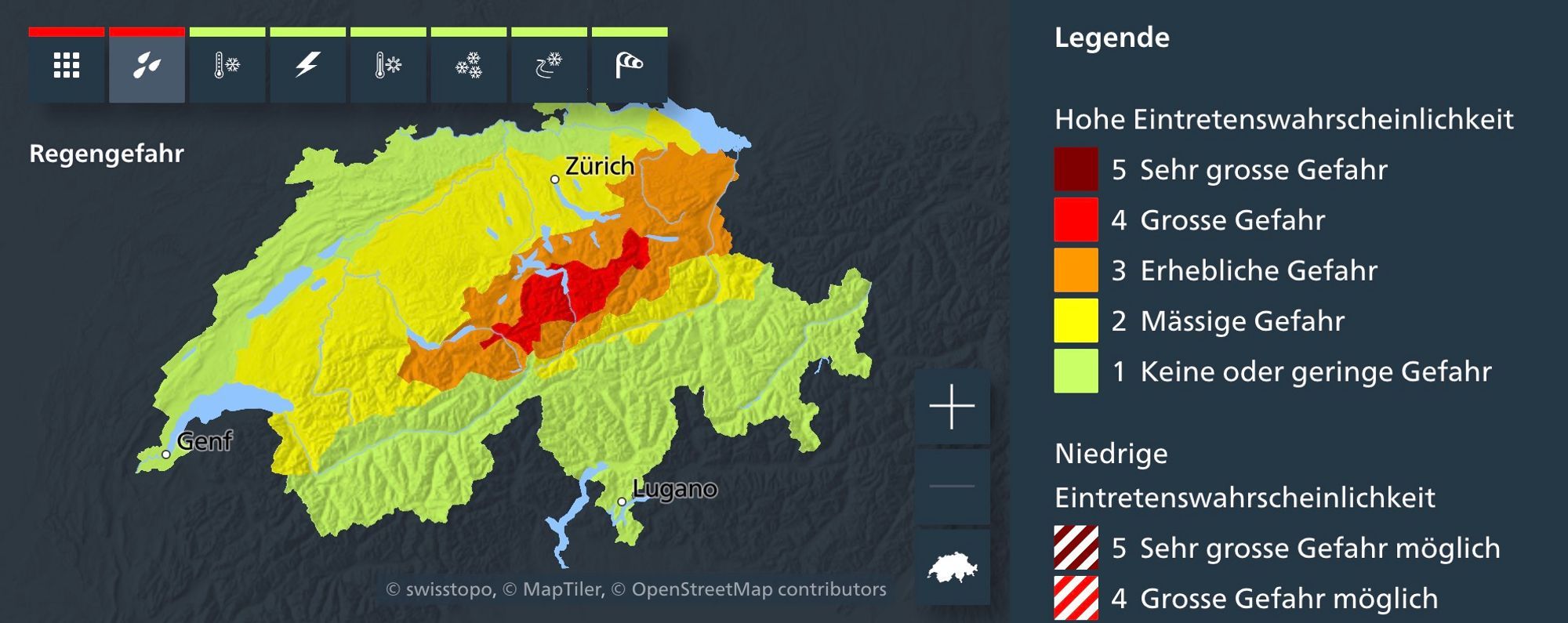 Het is helaas nog niet voorbij. Net als de afgelopen week hebben we te maken met een onstabiele noordwestelijke stroming waarmee tal van regengebieden en buien over de Alpen worden geloodst. Van tijd tot tijd gutst het, vooral aan de noordkant van de Alpen waar stuwing nog voor extra neerslagintensiteit zorgt. Vandaag en morgen valt er op veel plaatsen in Oostenrijk en Zwitserland opnieuw 50 tot 100 millimeter, lokaal 150 millimeter. In Zwitserland staan inmiddels nieuwe waarschuwingen uit voor overstromingen en aardverschuivingen: niveau 4 op een schaal van 5.