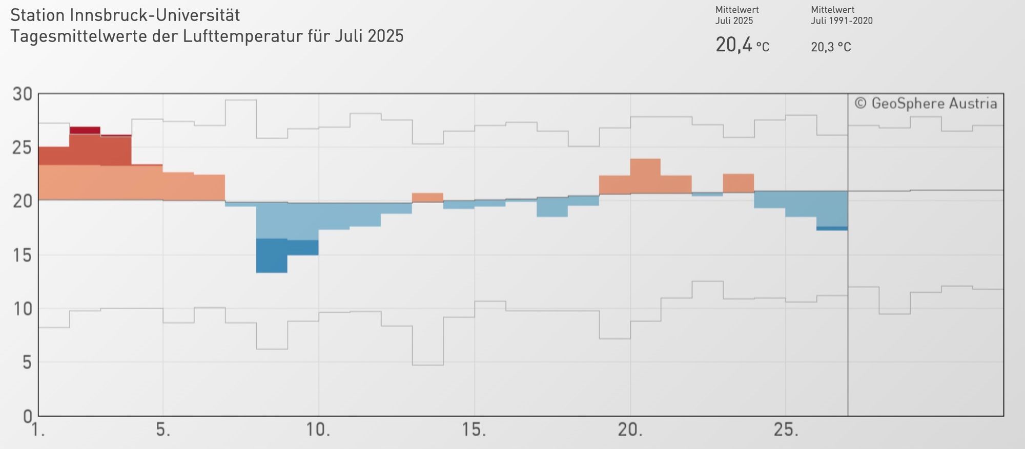 Door het wisselvallige weer van de afgelopen weken is deze zomer geen schim (meer) van de vele warme, zonnige zomers die achter ons liggen. Hij begon zo veelbelovend met een extreem warme junimaand. Ook de eerste 8 dagen van juli waren zeer warm, maar daarna sloeg het weer om met vaak koeler weer dan het langjarig gemiddelde. Desalniettemin ligt de gemiddelde julitemperatuur in Innsbruck nog rond de ‘normale waarde’ van 1991-2020. De lange, koele fase na 8 juli heeft de extreme hitte van begin juli nog niet kunnen compenseren.