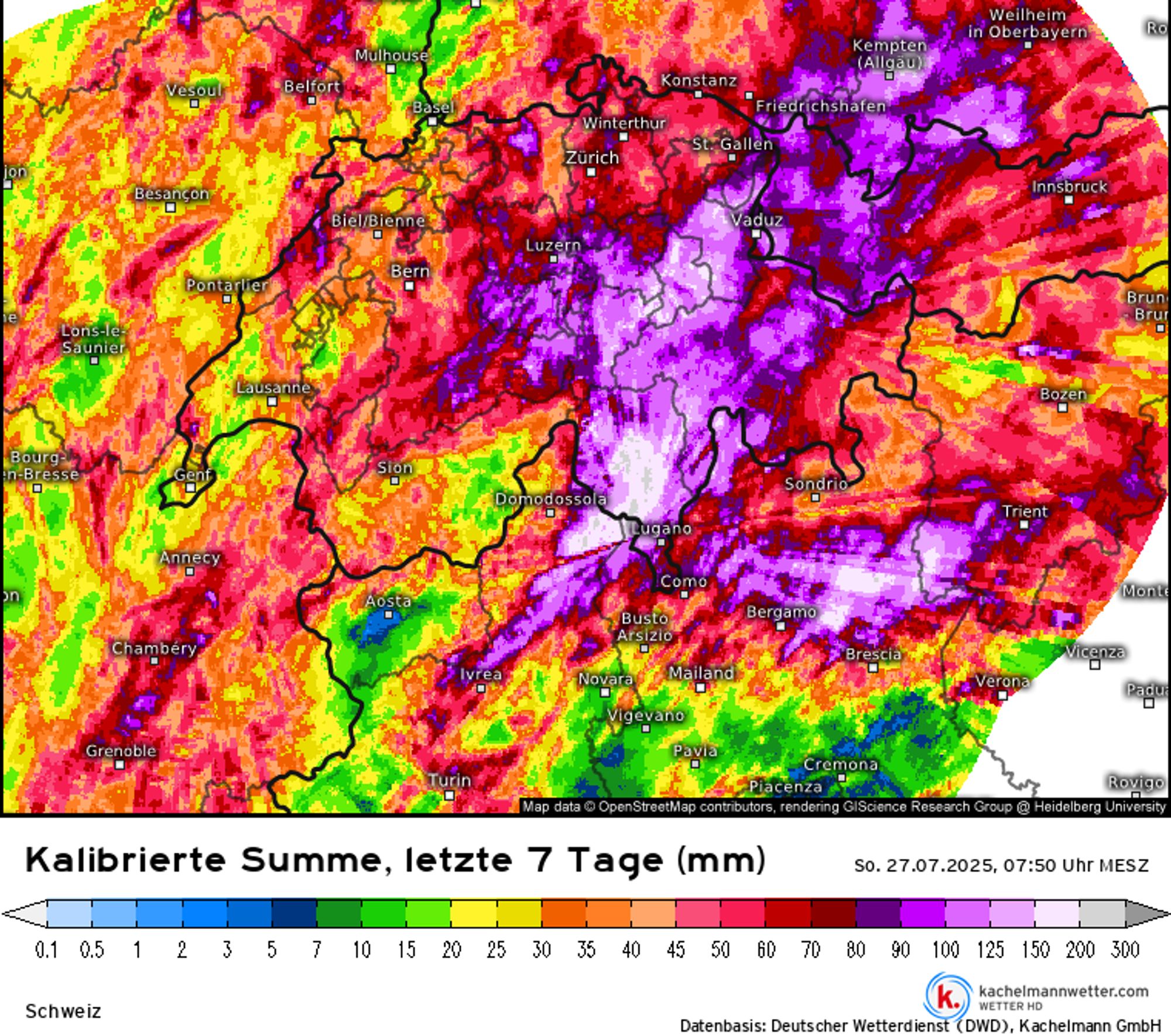 De nieuwsberichten van de afgelopen dagen spraken voor zich. Het is bar en boos in grote delen van de Alpen. Ik heb de gekalibreerde radarsommen van de afgelopen 7 dagen er even bijgepakt. Op deze kaarten zijn de radarbeelden over elkaar heengelegd en vergeleken met weerstations op de grond, waardoor visueel een goed beeld ontstaat van de hoeveelheden regen. In een week tijd viel er op uitgebreide schaal meer dan 60 millimeter; in hotspots als Zuid-Duitsland en het zuiden en oosten van Zwitserland zelfs meer dan 150 millimeter. Dat is ongeveer het dubbele van wat er bij ons gemiddeld in een hele julimaand valt.