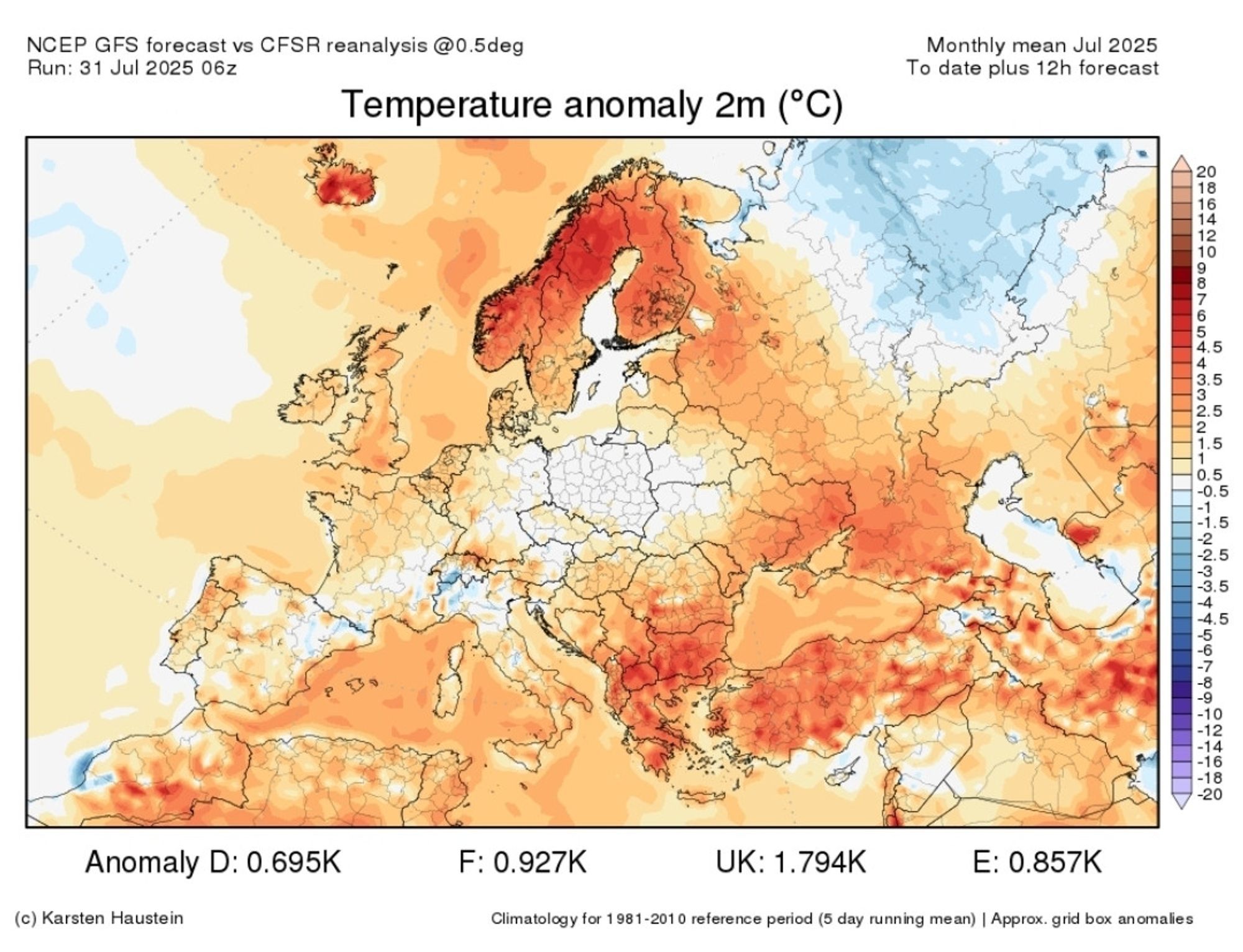 Frankrijk en Italië waren duidelijk minder somber, maar ook daar was het koel vergeleken met voorgaande jaren. Het Italiaanse Zuid-Tirol had de koelste juli in 11 jaar. Het was een halve graad koeler dan een gemiddelde juli in de periode 1991-2020, maar een graad wármer dan een juli uit 1961-1990. Verder opvallend: ondanks de koele julimaand staat de zomer van 2025 na twee maanden nog op plek 3 van warmste zomers sinds het begin van de metingen (in 1850). Dit dankzij de extreem warme juni. Tot slot nog even de temperatuurafwijking over juli in Europa. Echt fris was het alleen in delen van Rusland, zeer warm was het in Scandinavië.