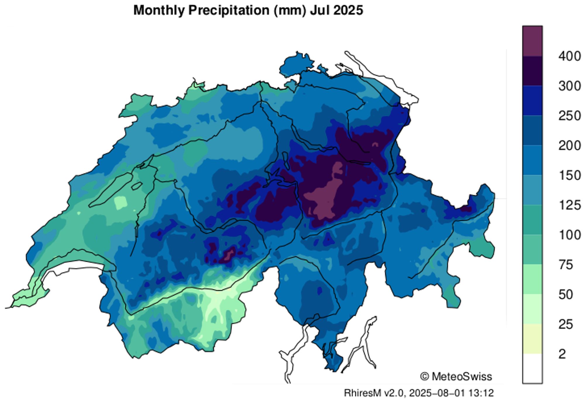 Hier zie je de neerslagkaart van juli in Zwitserland. Zeker de noordkant van de Alpen was extreem nat met lokaal meer dan 400 millimeter. Let op het droge vlekje van Oberwallis, hier viel slechts 25 millimeter. Iets wat we vaker zien van dit inneralpiene stukje Zwitserland. Ook in Oostenrijk viel op uitgebreide schaal meer dan 300 millimeter en sneuvelden diverse regenrecords, o.a. in Bregenz (398 mm) en Saalbach (309 mm).