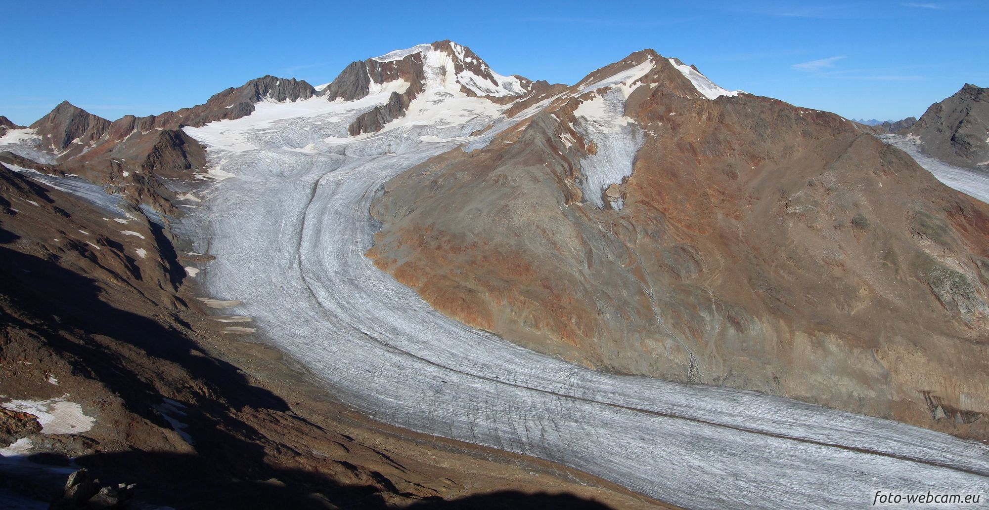 Morgen (dinsdag) bereikt vanuit het westen een hoogtestoring de Alpen. Daarmee groeit de kans op onweer, vooral in de westelijke Alpen, maar blijft het nog wel warm. In veel dalen zal het bij veel zon tussen de 25 en 30 graden zijn, lokaal nog iets warmer. Op 2000 meter is het zo’n 15 graden en ook op de meeste gletsjers is het ruim boven nul. Door het warme weer van de afgelopen weken ligt het gletsjerijs er weer open en bloot bij, waarmee de smeltstop van juli (die verliep veel minder warm) weer voorbij is.