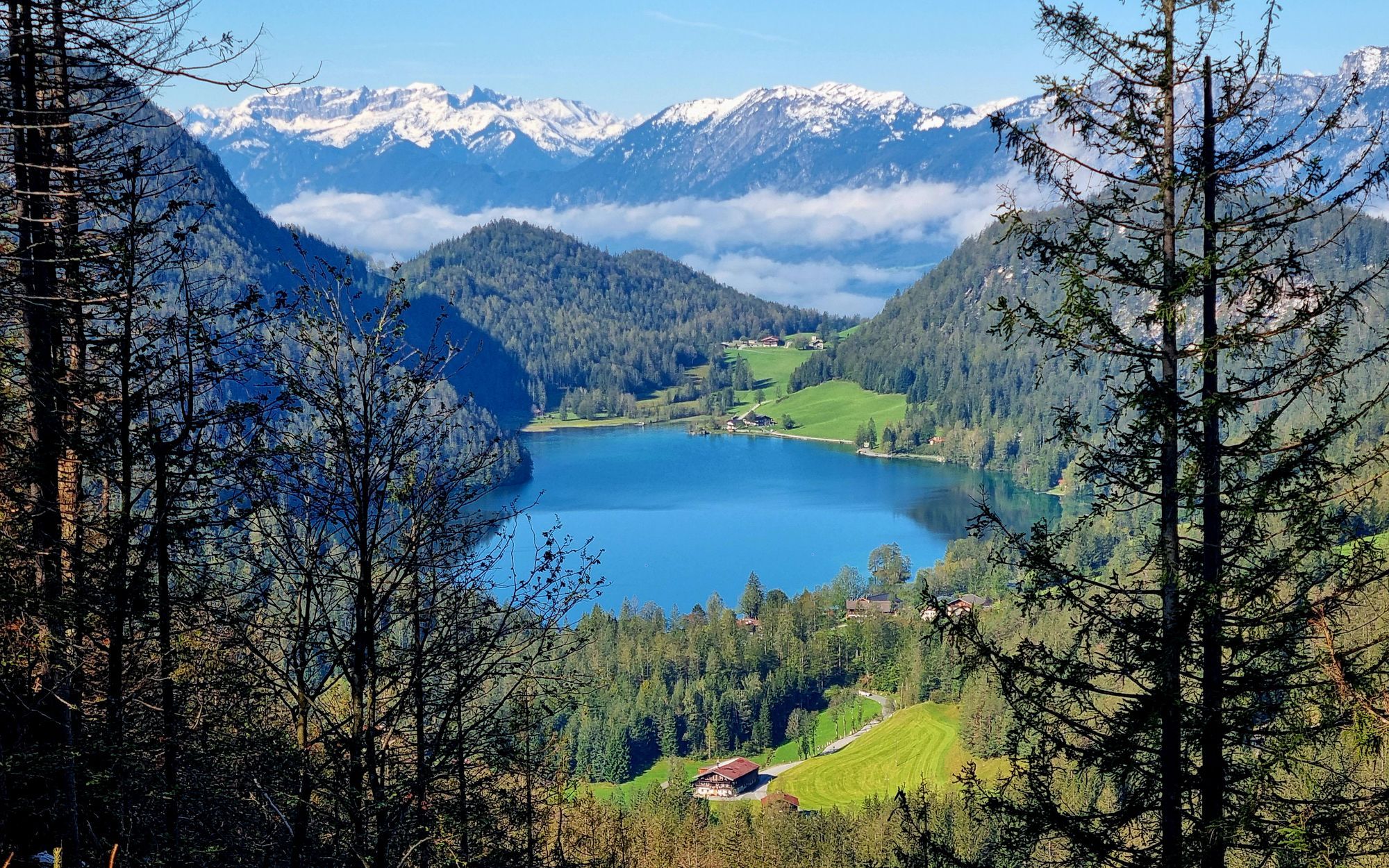 Intussen opent zich een fraai panorama met uitzicht op de Hohe Salve. De sneeuw steekt magisch af tegen het felgroene gras. We lopen verder en zien intussen de Hintersteiner See liggen, nog zo’n trekpleister die 's zomers zeer goed bezocht wordt. Ook nu zijn de terrassen aardig gevuld en profiteren wandelaars van het mooie weer. Na een korte stop bij Jausenstation Maier gaat het iets steiler omhoog richting de Kreuzbichl. In T-shirt lopen we door een witte wereld, maar de septemberzon heeft de paden al prima begaanbaar gemaakt. Boven bij het kruis blijken de woorden van Stephan niet gelogen; je hebt zicht van de Duitse Vooralpen tot het Nationalpark Hohe Tauern met daar tussenin het brede Inntal. Net onder de top liggen een paar hutten. Het is lunchtijd dus we strijken neer bij de 350 jaar oude Stöfflhütte. Op het terras wanen we ons bijna op een skivakantie! Na een lekker broodplankje zetten we de afdaling in naar het dal. Zo snel als het sneeuwdek zich aandiende, zo rap is hij ook weer verdwenen. De sneeuw heeft weer plaatsgemaakt voor frisgroen gras en in de Hintersteiner See wordt zowaar gezwommen. Ook de vele insectengeluiden verraden dat het zomerseizoen nog niet voorbij is.